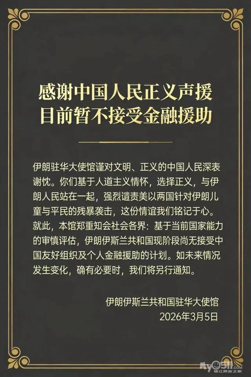 伊朗驻华大使馆3月5日在其微信公众号官方账号上发文说,感谢中国人民正义声援。