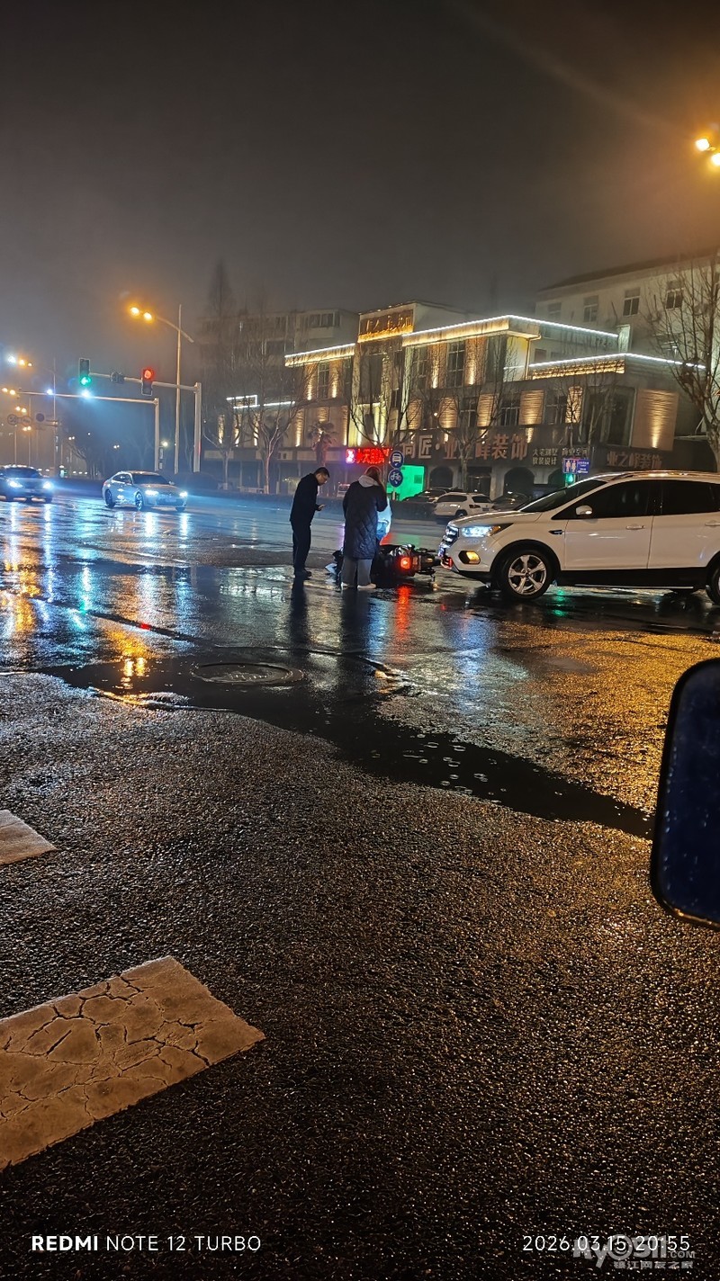 塔山路加油站的红绿灯处发生一起交通事故,雨天路滑注意安全!