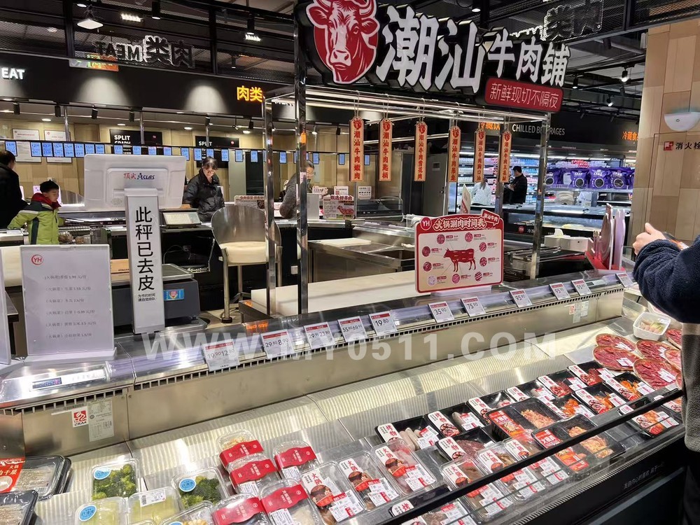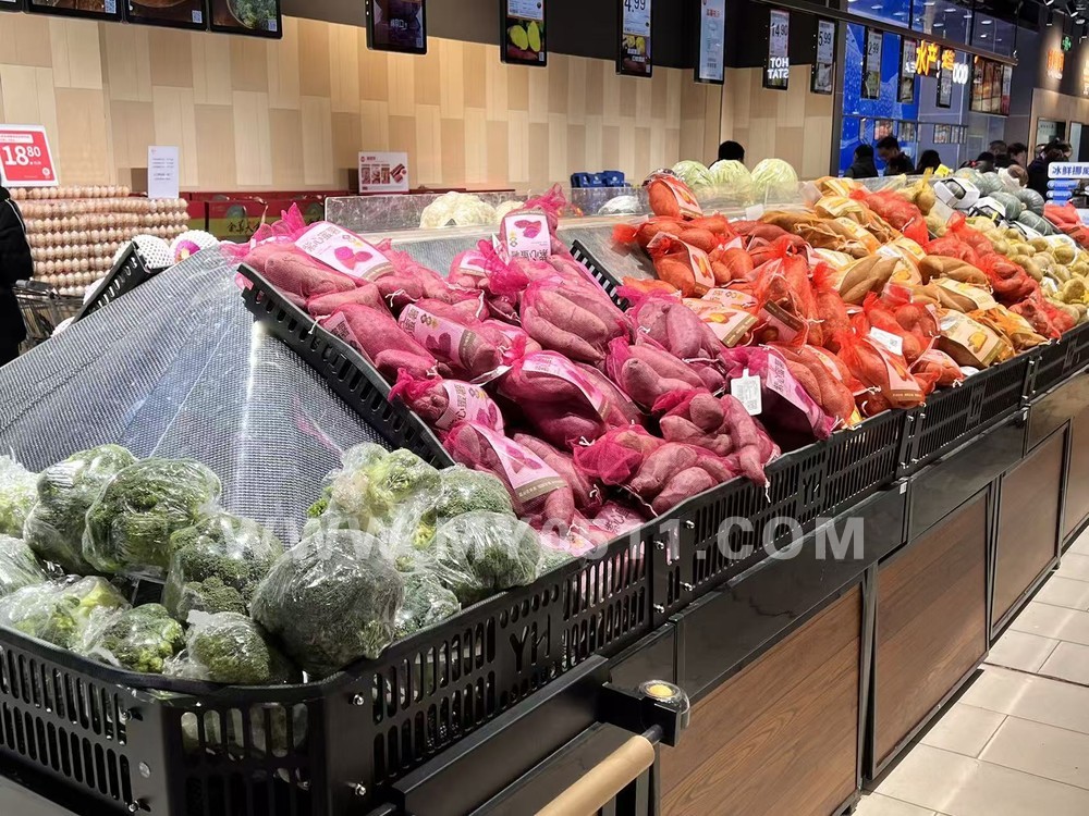 生鲜区域的布局和之前总体一致,先是蔬菜+水果,后方是水产+鲜肉,再往后是冷冻食品