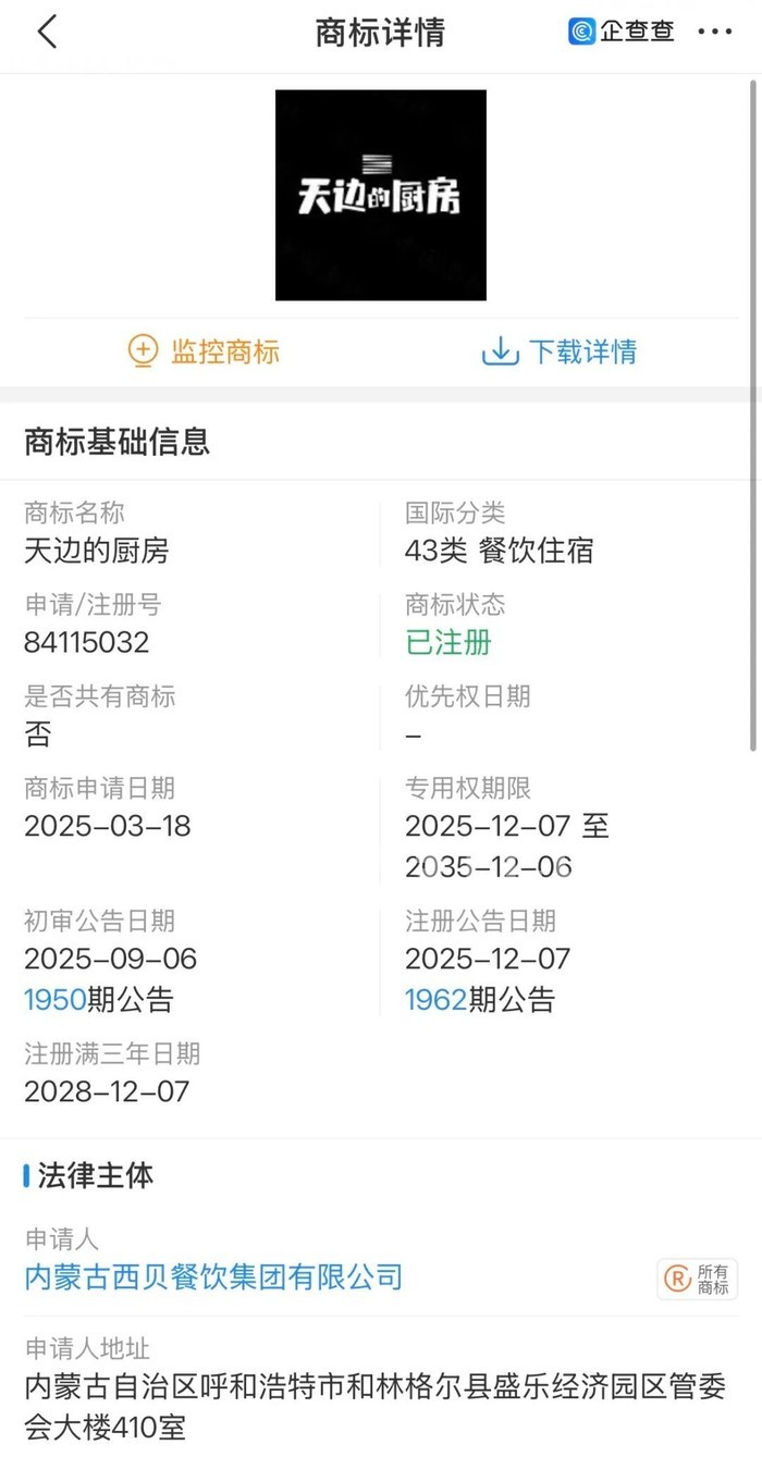 企查查APP显示,内蒙古西贝餐饮集团有限公司已申请多枚“天边”“天边的厨房”商标,国际分类涉及餐饮住宿、材料加工、教育娱乐等,目前多数已注册成功。