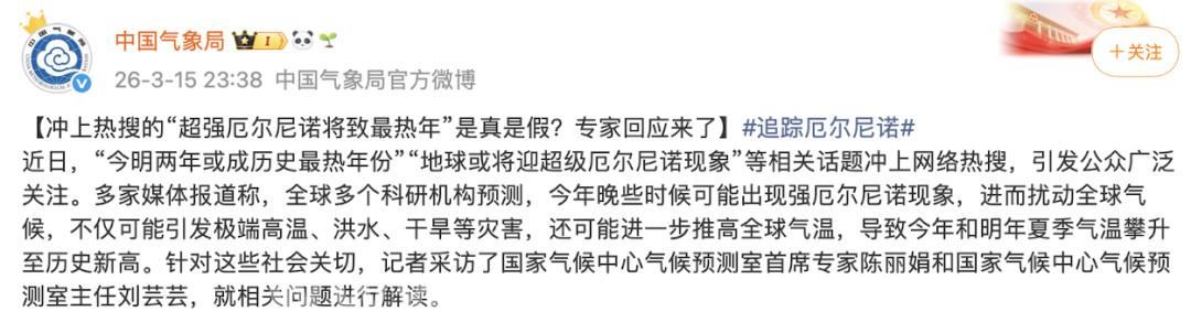 3月15日,国家气候中心气候预测室首席专家陈丽娟、国家气候中心气候预测室主任刘芸芸对此进行了回应。他们认为,现在就断定今年会出现“超级厄尔尼诺”为时过早