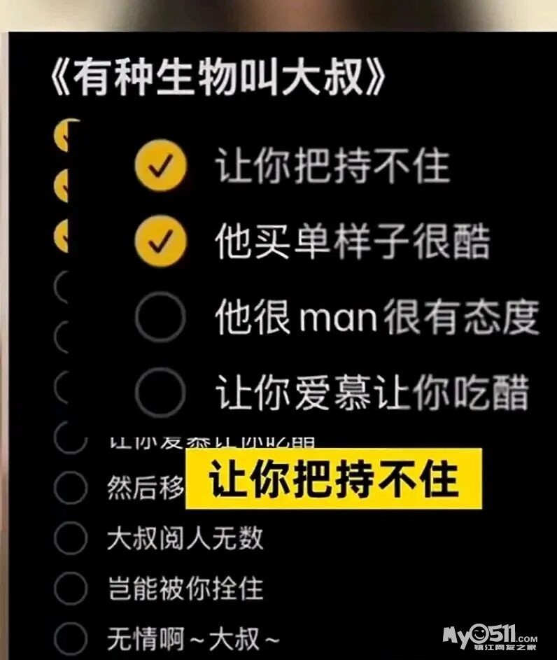 歌词的内容是“有种生物叫大叔,让你把持不住,买单样子很酷。”