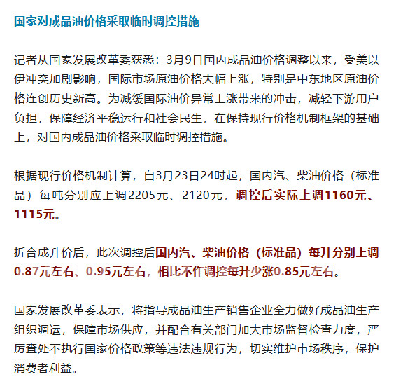 根据现行价格机制计算,自3月23日24时起,国内汽、柴油价格(标准品)每吨分别应上调2205元、2120元,调控后实际上调1160元、1115元。