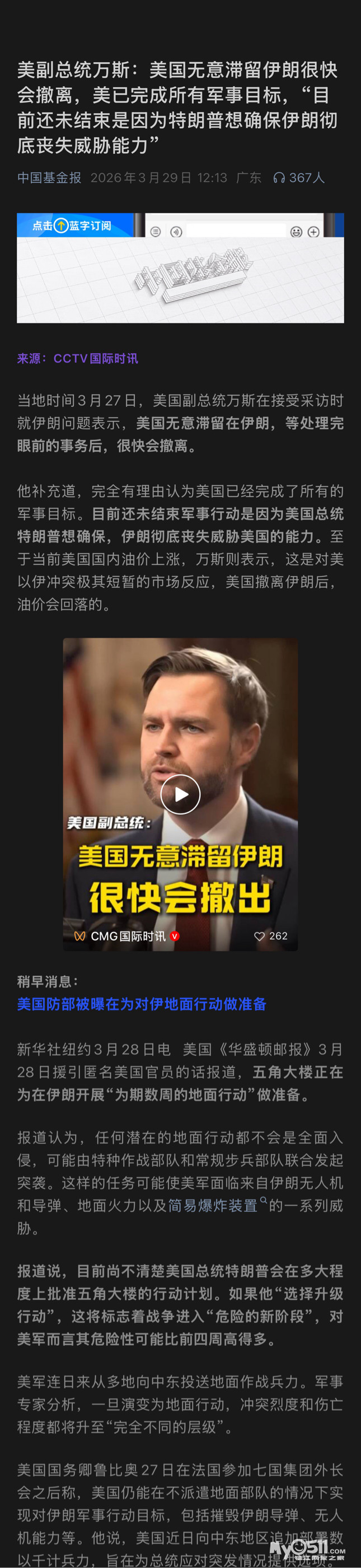 万斯:美军很快就撤