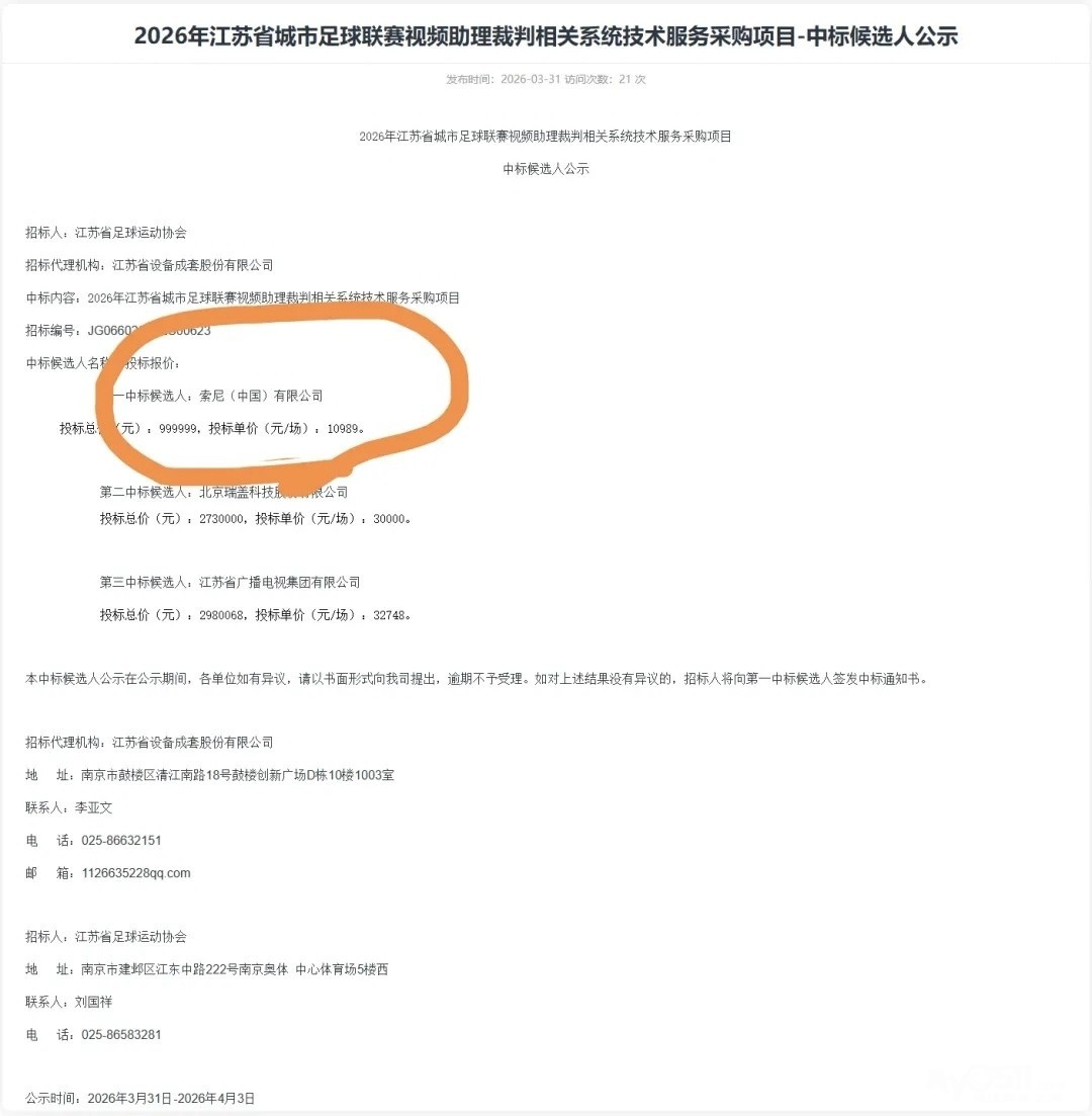 今年苏超的视频助理裁判(VAR)服务商大概率是日本索尼。下图是刚刚公布的招标。