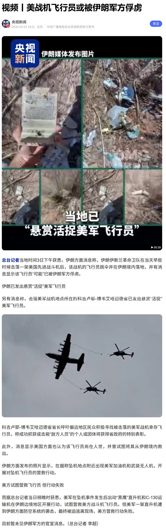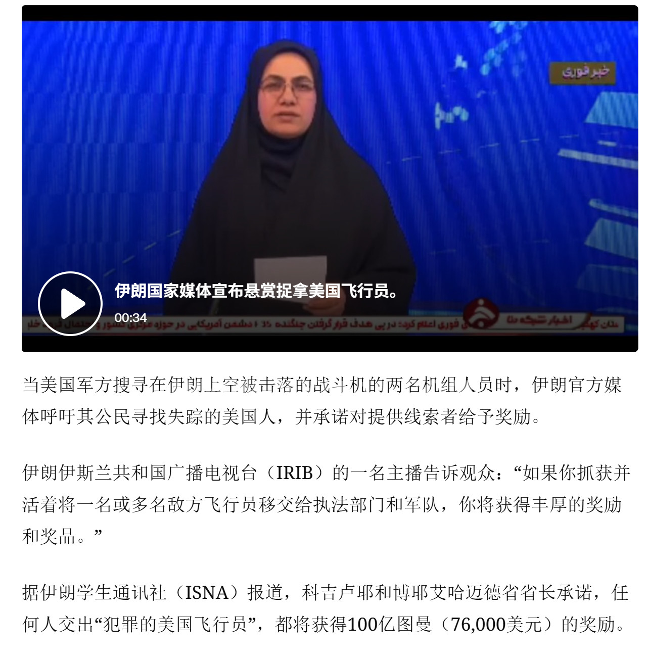 德黑兰的一个重要代表团宣布悬赏200亿托曼(相当于15万多美元)寻找美国战斗机飞行员。
