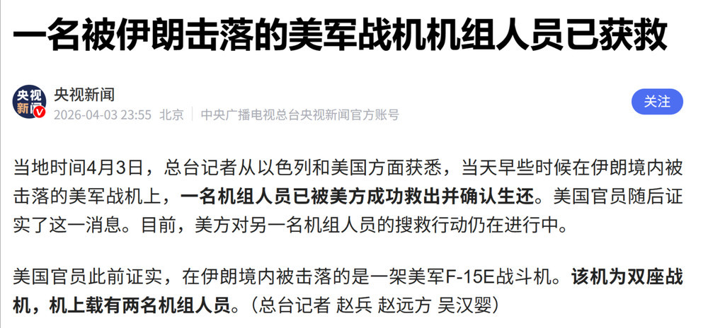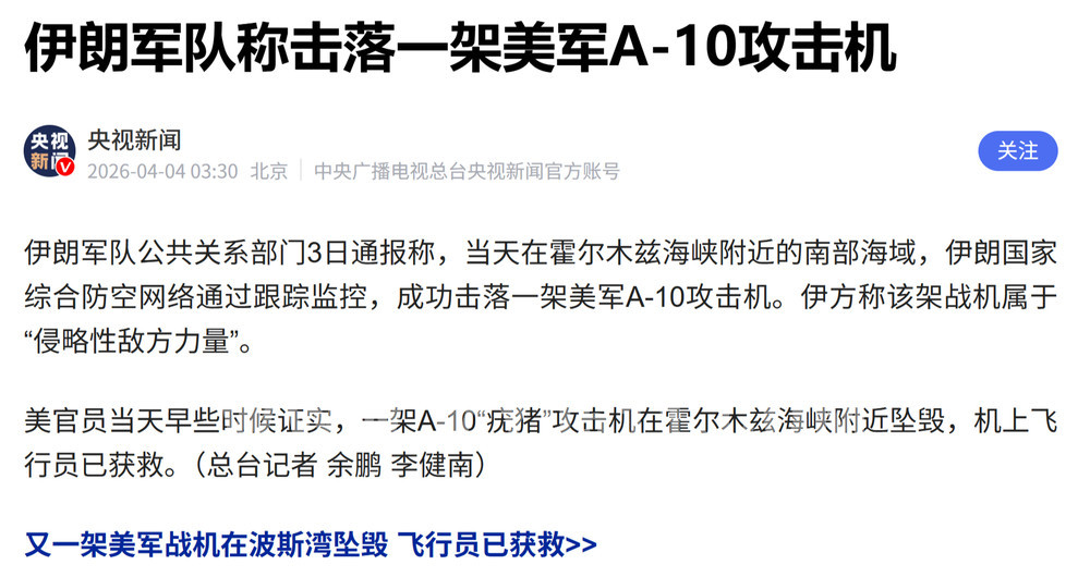 百姓话题  >  [焦点话题] 伊朗击落一架美军F-15E战机,两飞行员已获救 另有一架A-10被击坠毁