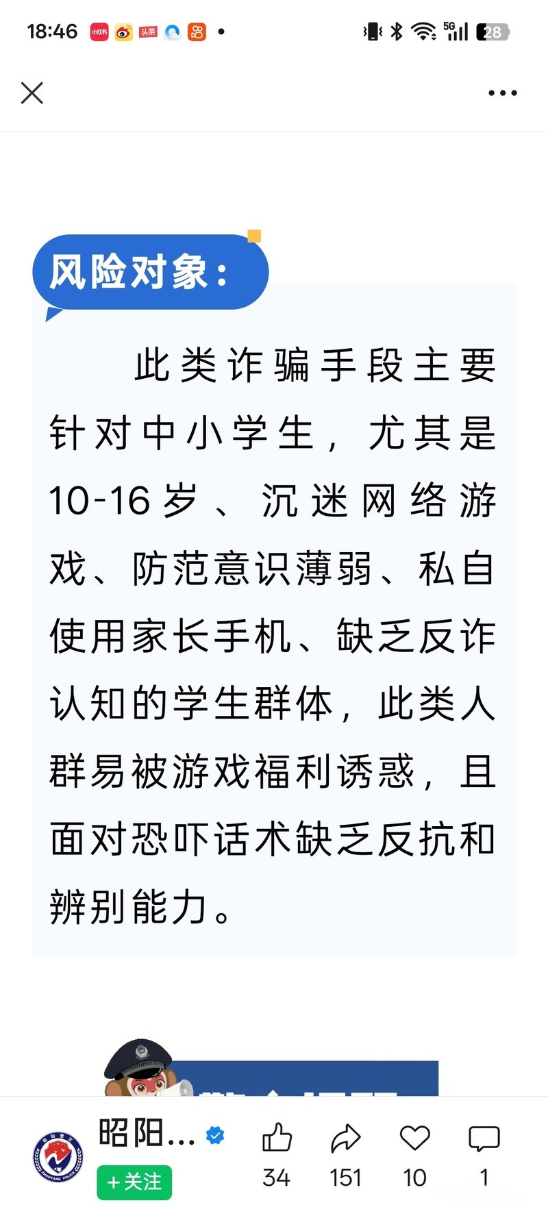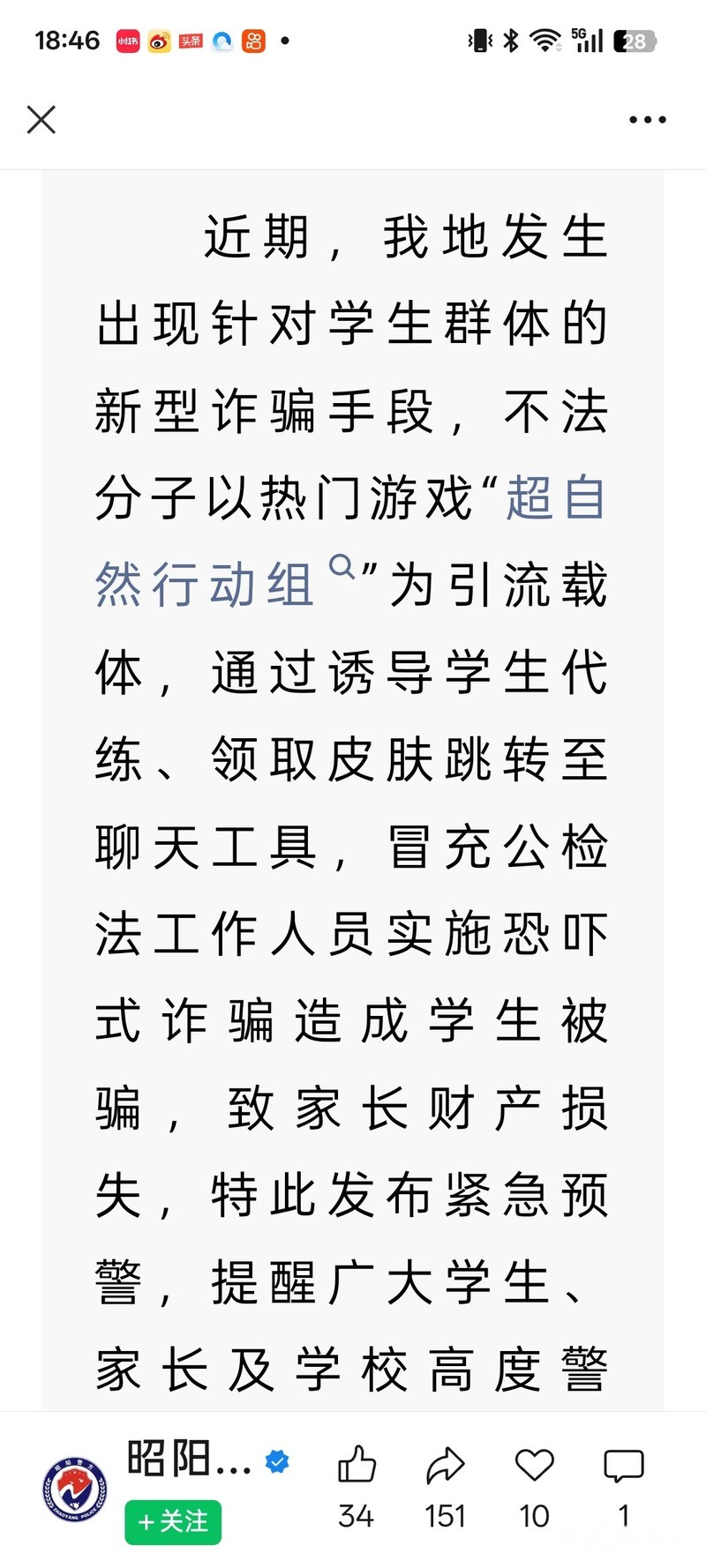 近期,多地发生出现针对学生群体的新型诈骗手段,不法分子以热门游戏“超自然行动组”为引流载体,通过诱导学生代练、领取皮肤跳转至聊天工具,冒充公检法工作人员实施恐吓式诈骗造成学生被骗,致家长财产损失,特此发布紧急预警,提醒广大学生、家长及学校高度警惕,严防上当受骗。