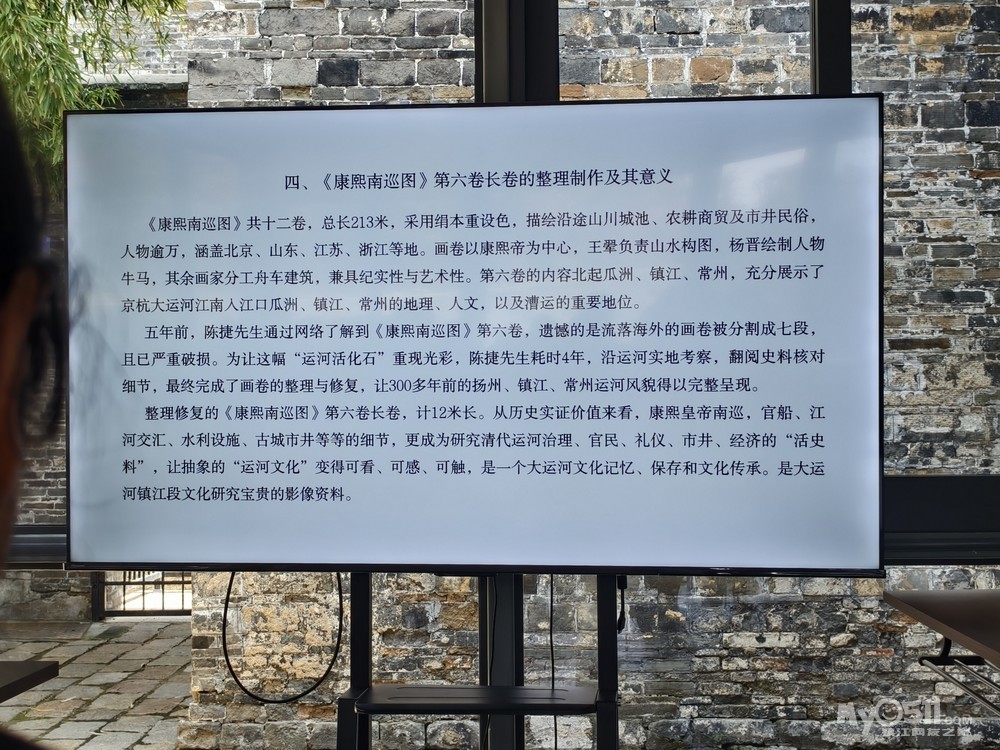 整理修复的《康照南巡图》第六卷长卷,计12米长。从历史实证价值来看,康照南巡,官船、江河交汇、水利设施、古城市井等等的细节,更成为研究清代运河治理、官民、礼仪、市井、经济的“活史料”,让抽象的“运河文化”变得可看,可感、可触,是一个大运河文化记忆、保存和文化传承。是大运河镇江段文化研究宝贵的影像资料。