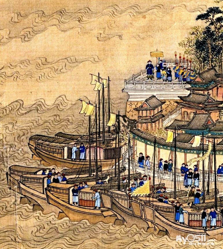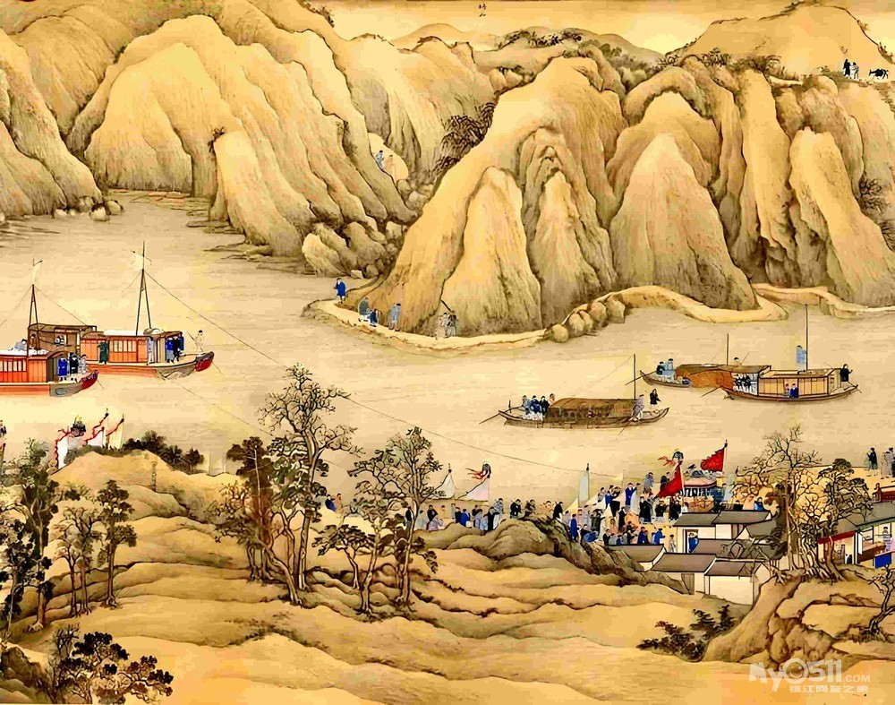 《康熙南巡图》共十二卷,总长213米,采用组本重设色,描绘沿途山川城池、农街商贸及市井民俗,人物逾万,涵盖北京、山东、江苏、浙江等地。画卷以康熙帝为中心,王翚负责山水构图,杨晋绘制人物牛马,其余画家分工舟车建筑,兼具纪实性与艺术性。第六卷的内容北起瓜洲、镇江、常州,充分展示了京杭大运河江南人江口瓜洲、镇江、常州的地理、人文,以及漕运的重要地位。
