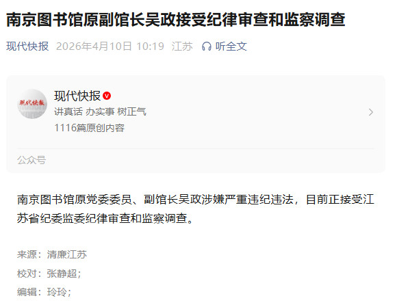 南京图书馆原副馆长吴政接受纪律审查和监察调查