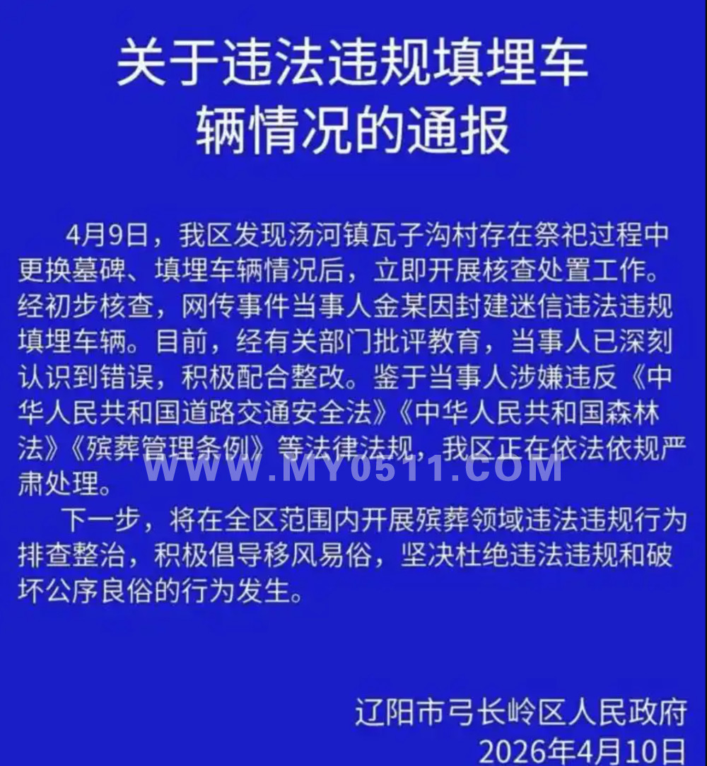 辽阳市弓长岭区人民政府4月10日通报:4月9日,该区发现汤河镇瓦子沟村存在祭祀过程中更换墓碑、填埋车辆情况后,立即开展核查处置工作。经初步核查,网传事件当事人金某因封建迷信违法违规填埋车辆。目前,经有关部门批评教育,当事人已深刻认识到错误,积极配合整改。鉴于当事人涉嫌违反相关法律法规,弓长岭区正在依法依规严肃处理。