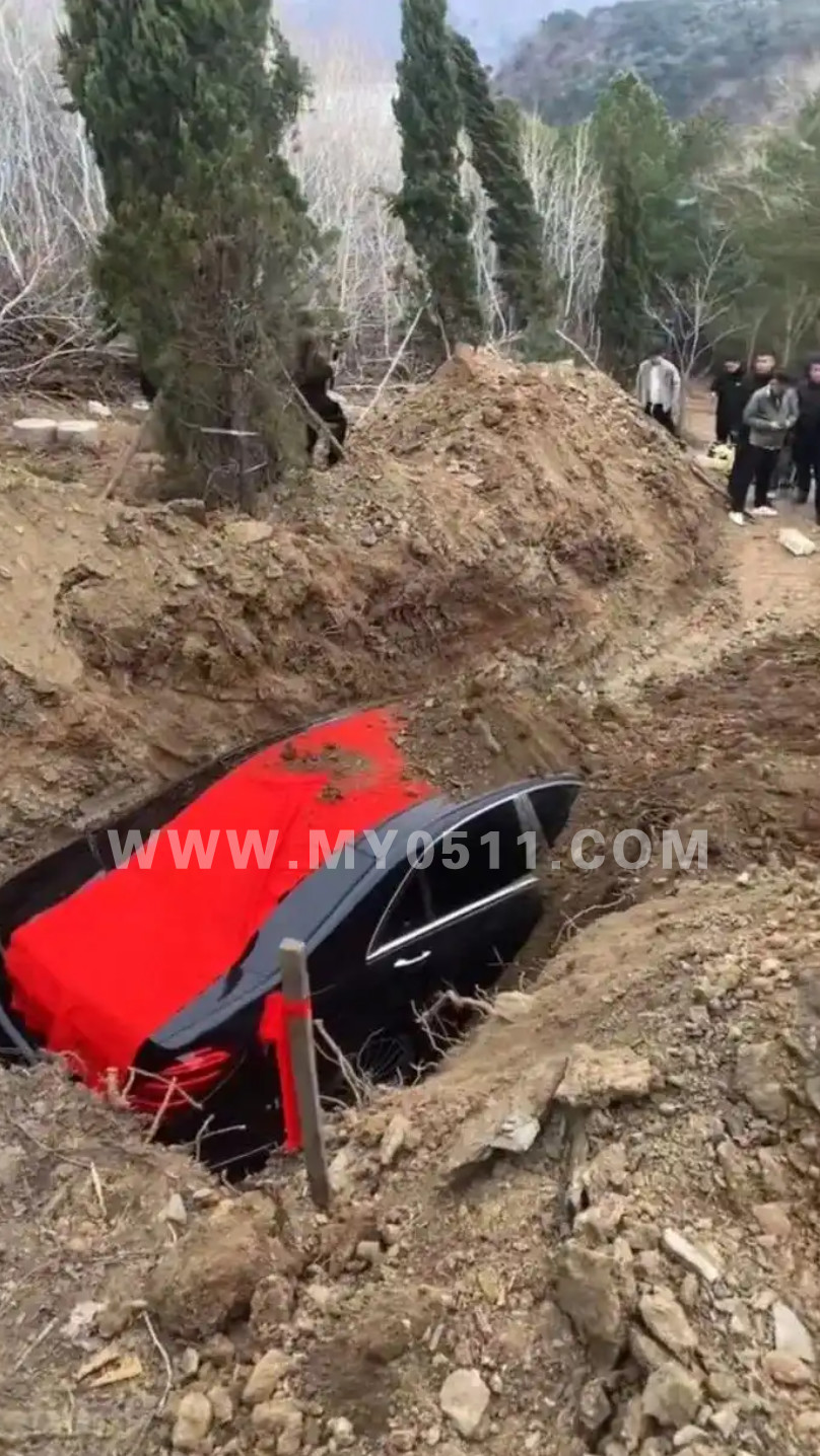 一座刚修好的墓碑旁边,有一辆挖掘机正吊起一辆黑色的奔驰汽车,众人合力将汽车推入挖好的墓坑。随后,车辆被埋入土中,疑似作为陪葬品下葬。