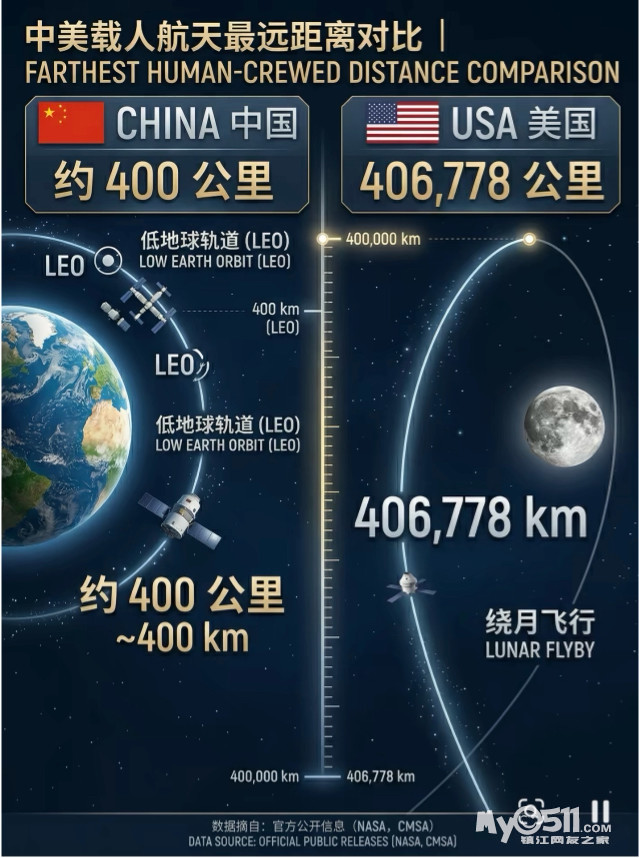 中国至今还没有载人登月或者绕月任务,都是地球轨道上的任务,没飞那么远很正常。不过,中国登月路线图是2030前登月,看不出美国未来有更早登月的计划,这也是美国人急着赶紧弄个掠月的原因,就这还大肆宣传为绕月,至少先降速到月球轨道然后绕月一圈才能说是绕月飞行。