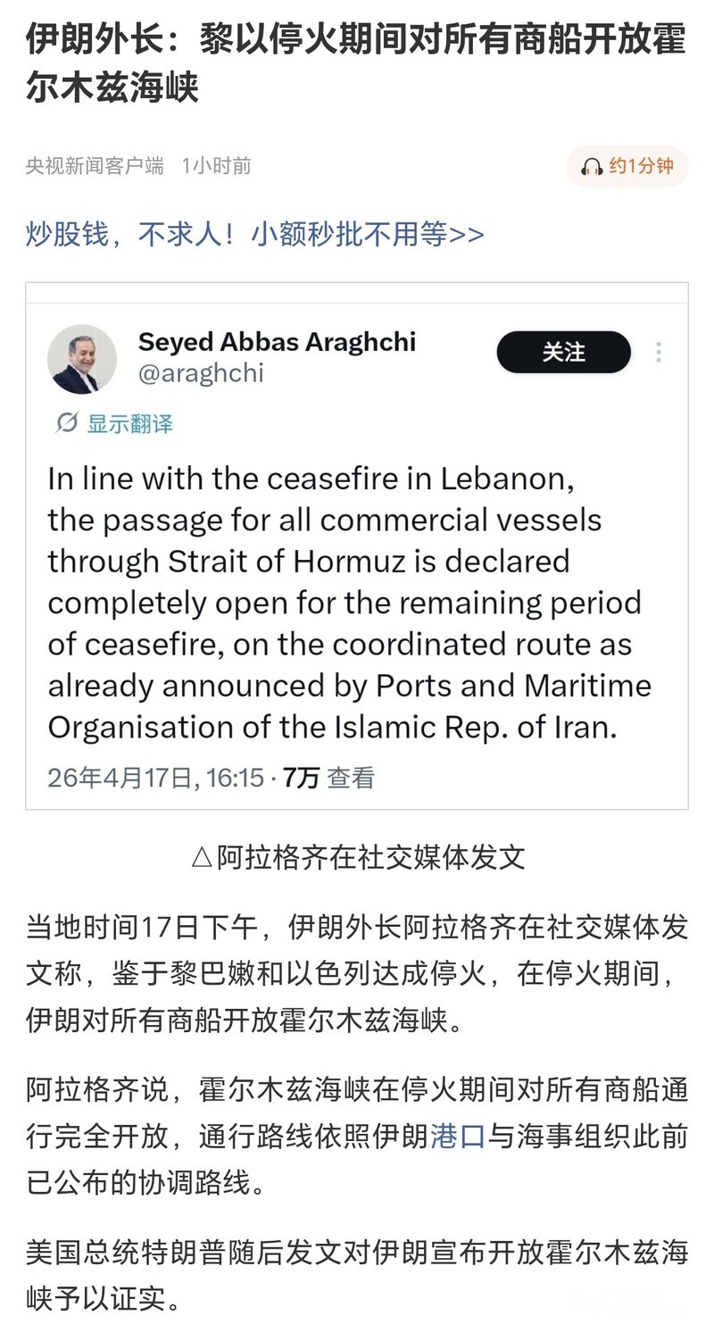 伊朗外长:黎以停火期间对所有商船开放霍尔木兹海峡