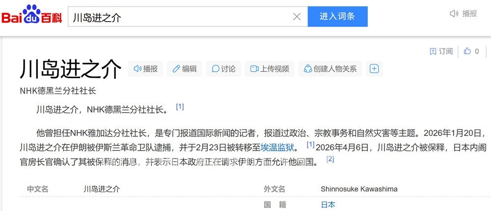 一名去年被捕,3月份“刑满释放”回日本,另一名——川岛进之介,NHK德黑兰分社社长,前几天已获保释,正在谋求回国。