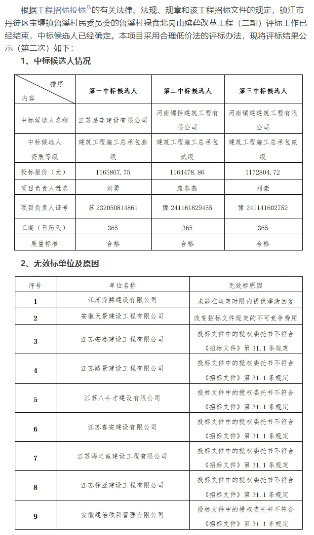 第二次公告显示:参与投标人21家,有效投标人12家,评审基准值仍然为1169085.31 ,拟中标单位依旧为江苏慕李建设有限公司