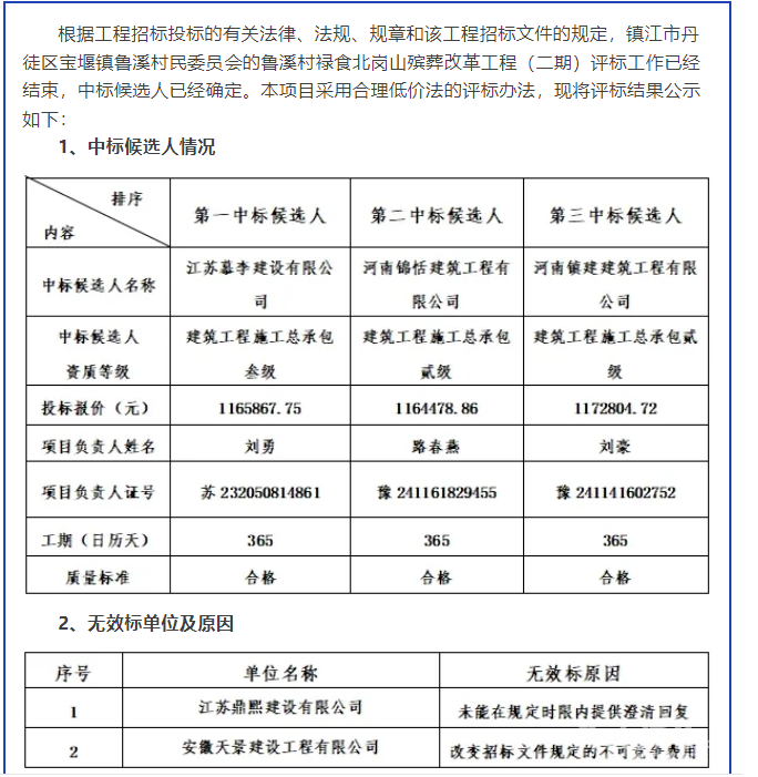 第一次公告显示:参与投标人21家,有效投标人19家,评审基准值为1169085.31 ,拟中标单位江苏慕李建设有限公司