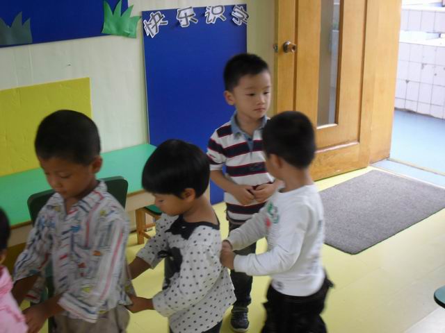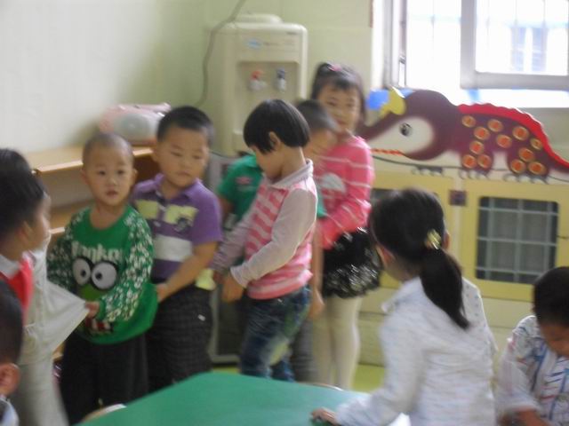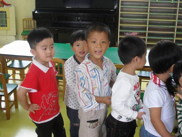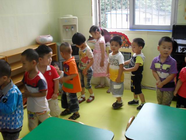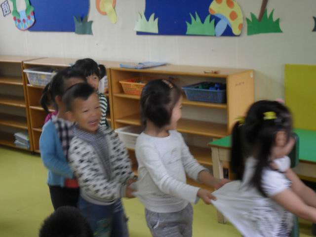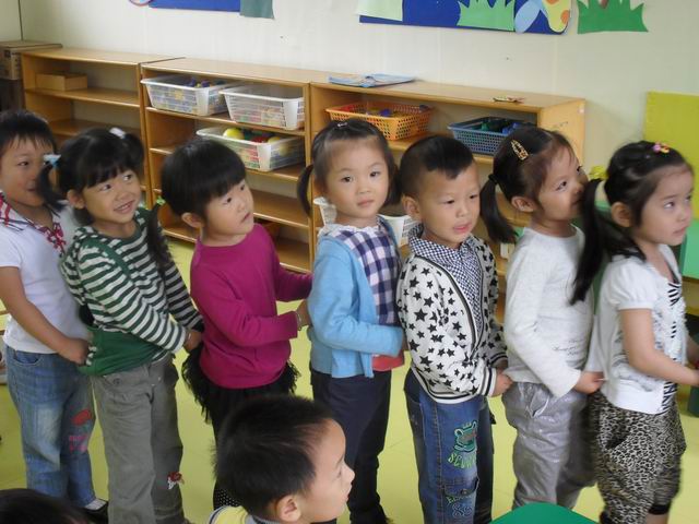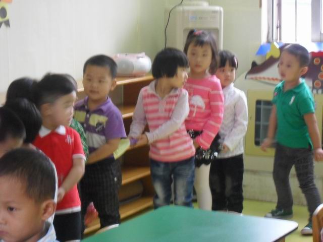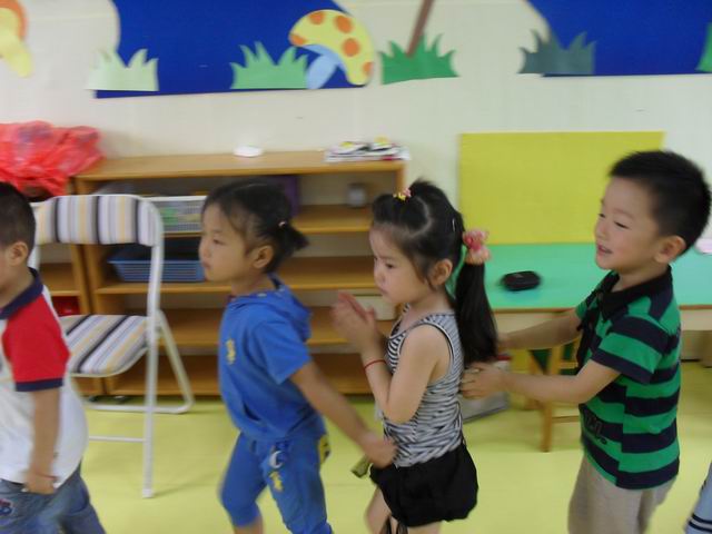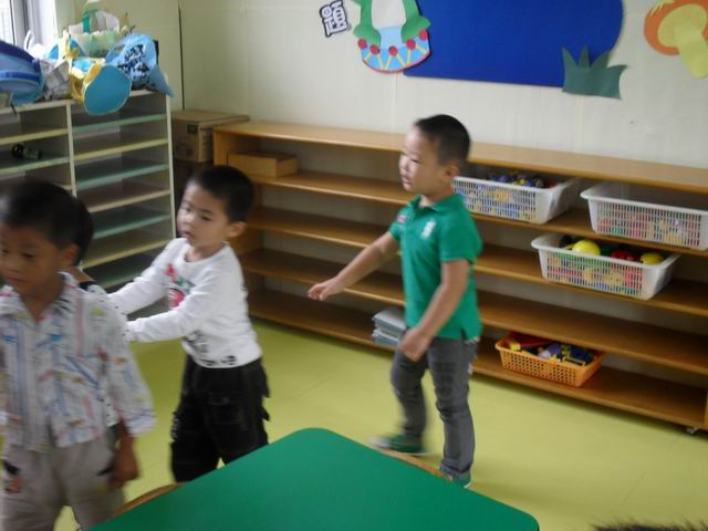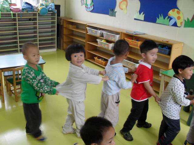 我们正在玩开火车的游戏哦,老师说火车开到北京了