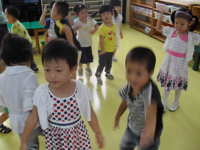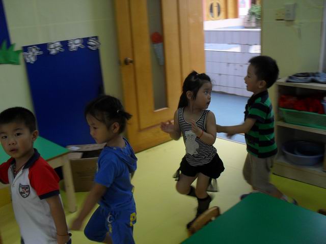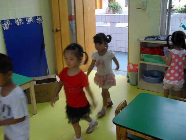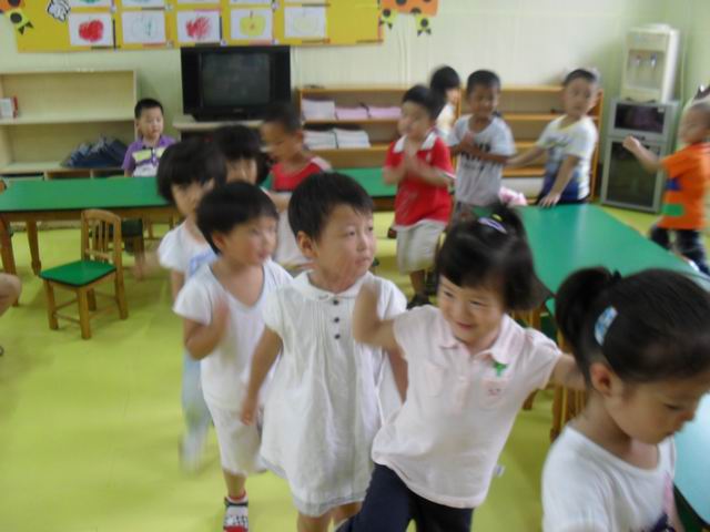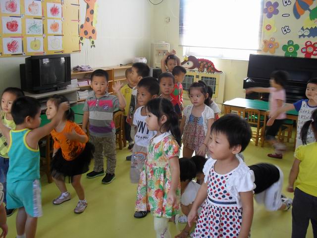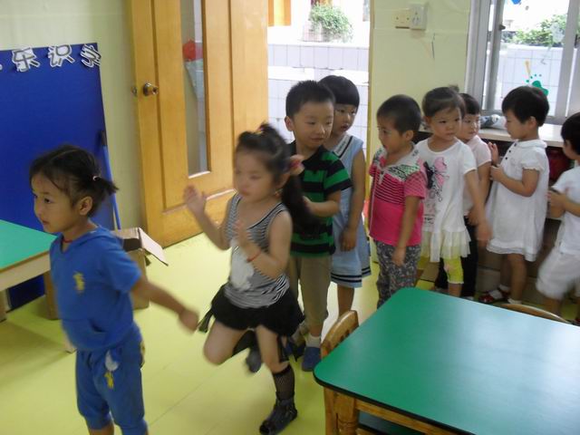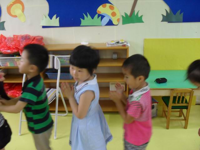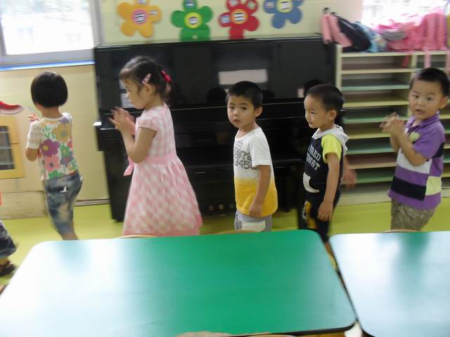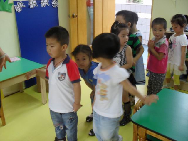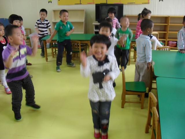 我们正在玩开火车的游戏哦,老师说火车开到北京了