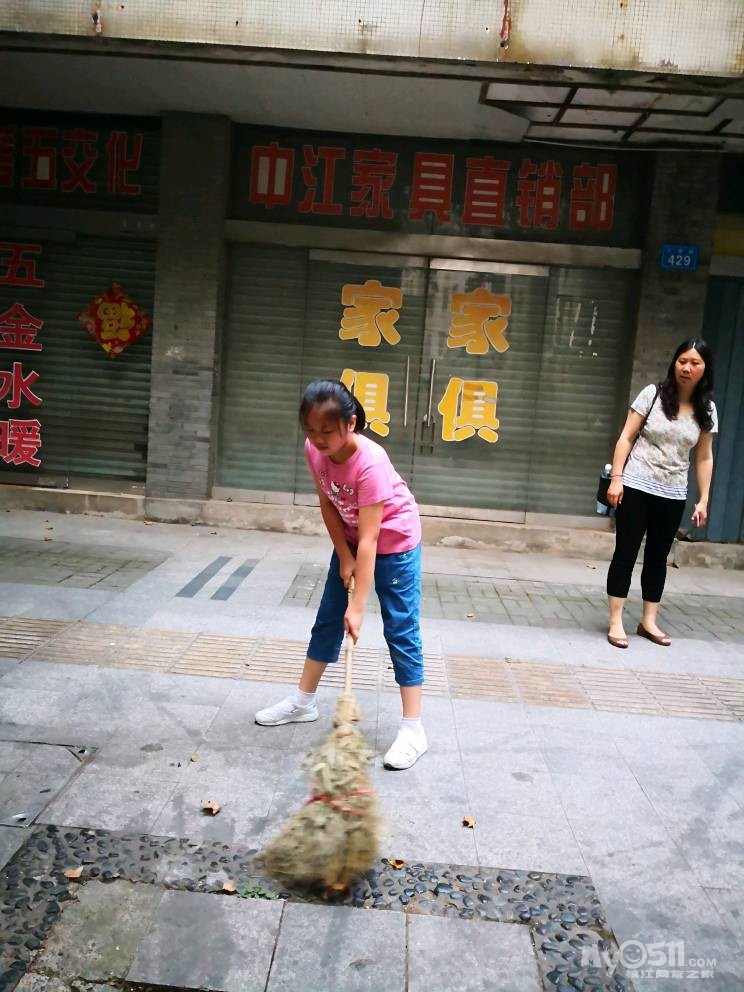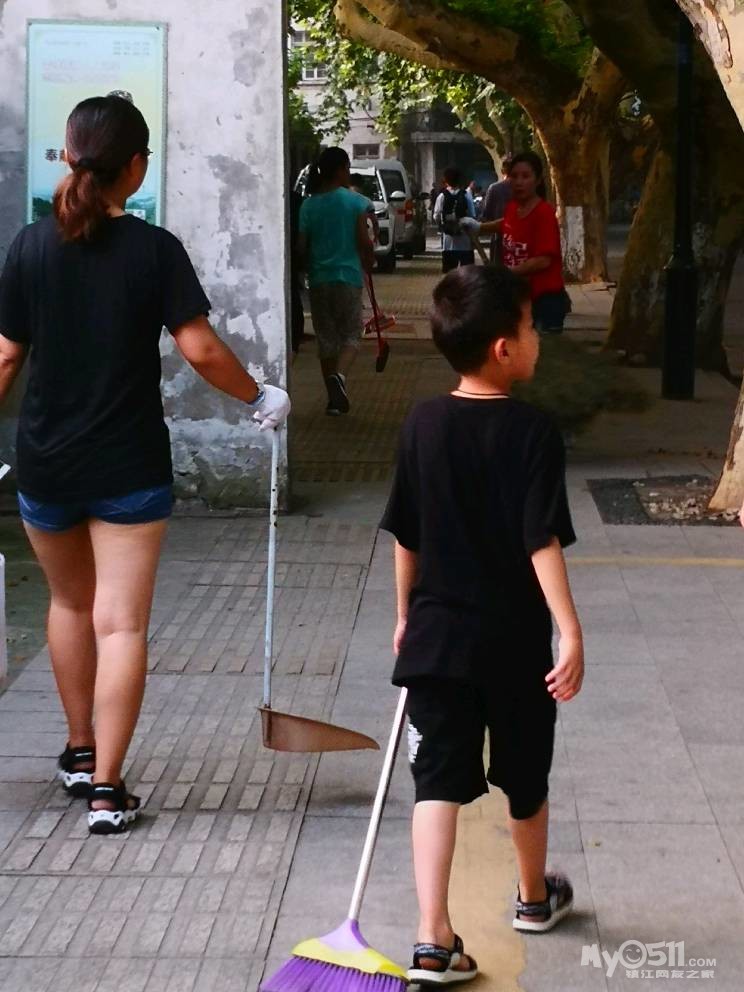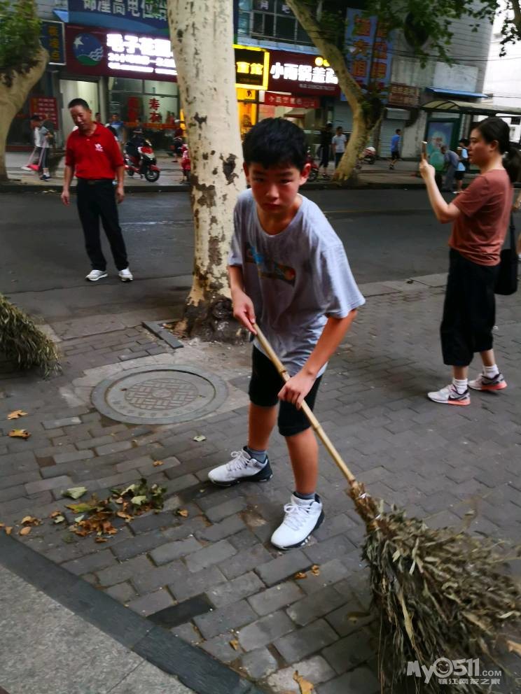 手持扫把舞起来,小朋友们干劲足。家长细细来示范,手握姿势向前推,落叶烟头废纸盒,圈成一堆易集中。左右开弓汗如雨,回望两侧干净又明亮,小小少年来感叹:环卫工人真不易,严寒酷暑城市来美化。平凡岗位让人敬