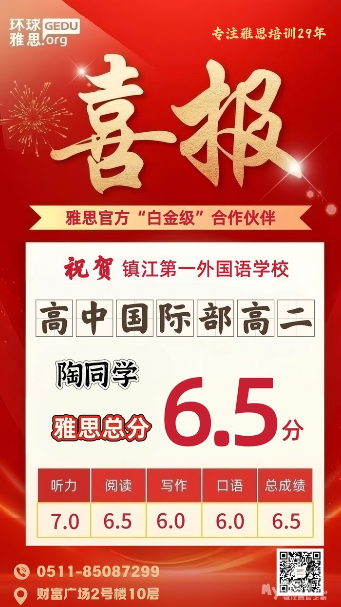 贺镇江第一外国语学校高中国际部高二陶同学雅思总分6.5分。雅思8人班85087299 [广告推广]