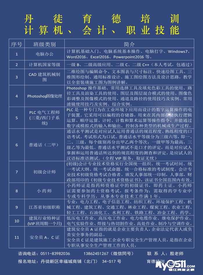 教育培训  >  [IT培训] 丹徒育德培训(电脑办公,CAD制图,初级会计,安监特种证,各专业论文) 现已招生,欢迎咨询      [广告推广]