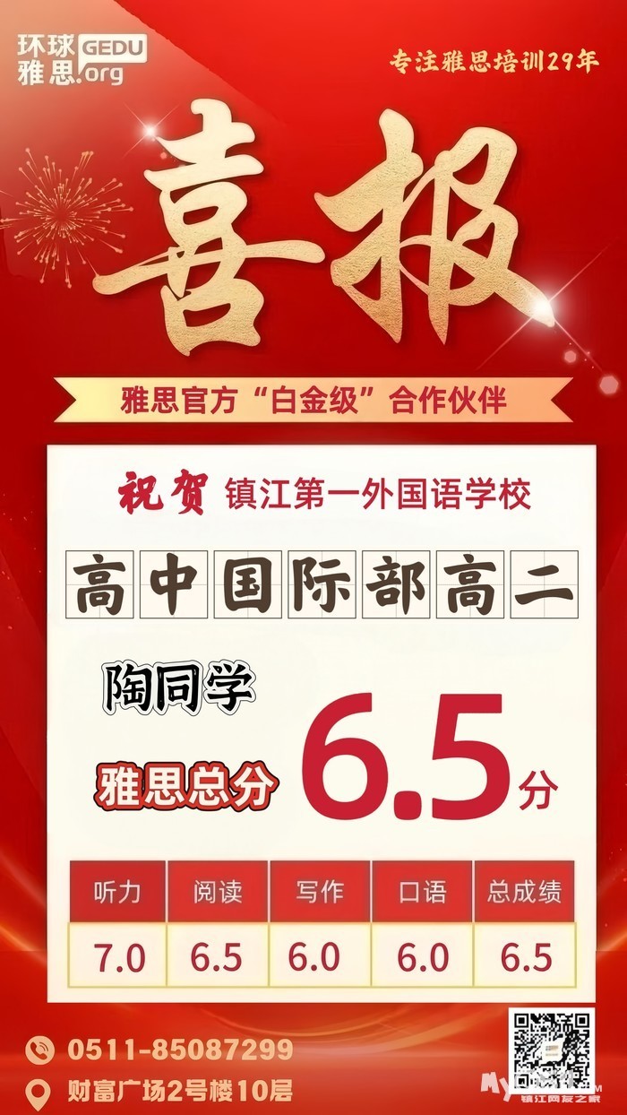 贺镇江第一外国语学校高中国际部高二陶同学雅思总分6.5分。雅思8人班85087299 [广告推广]