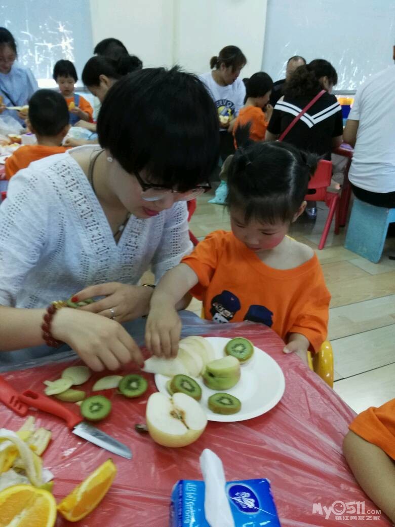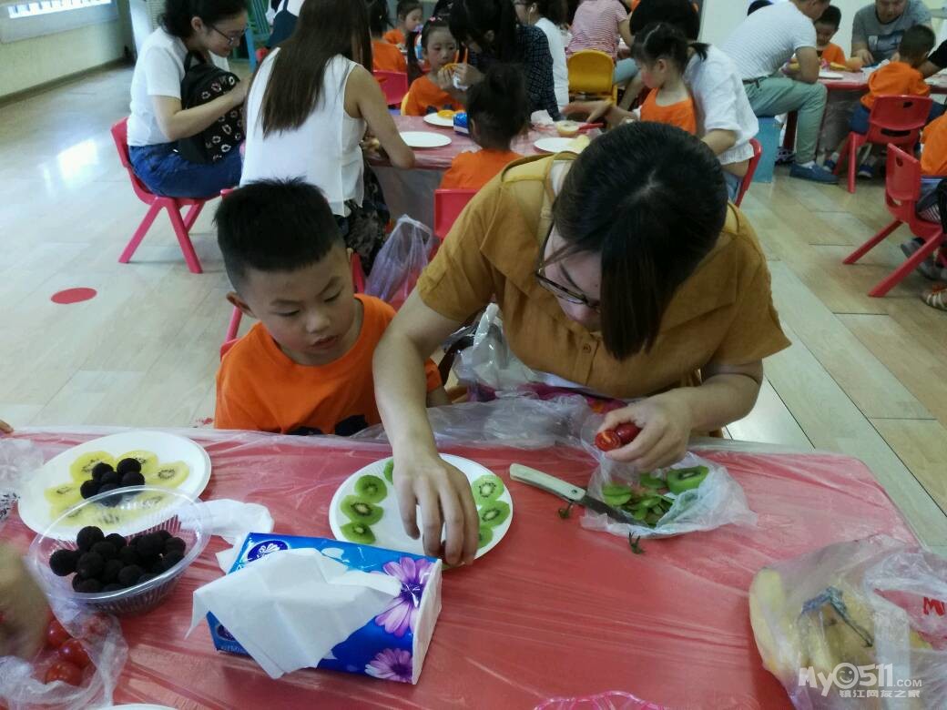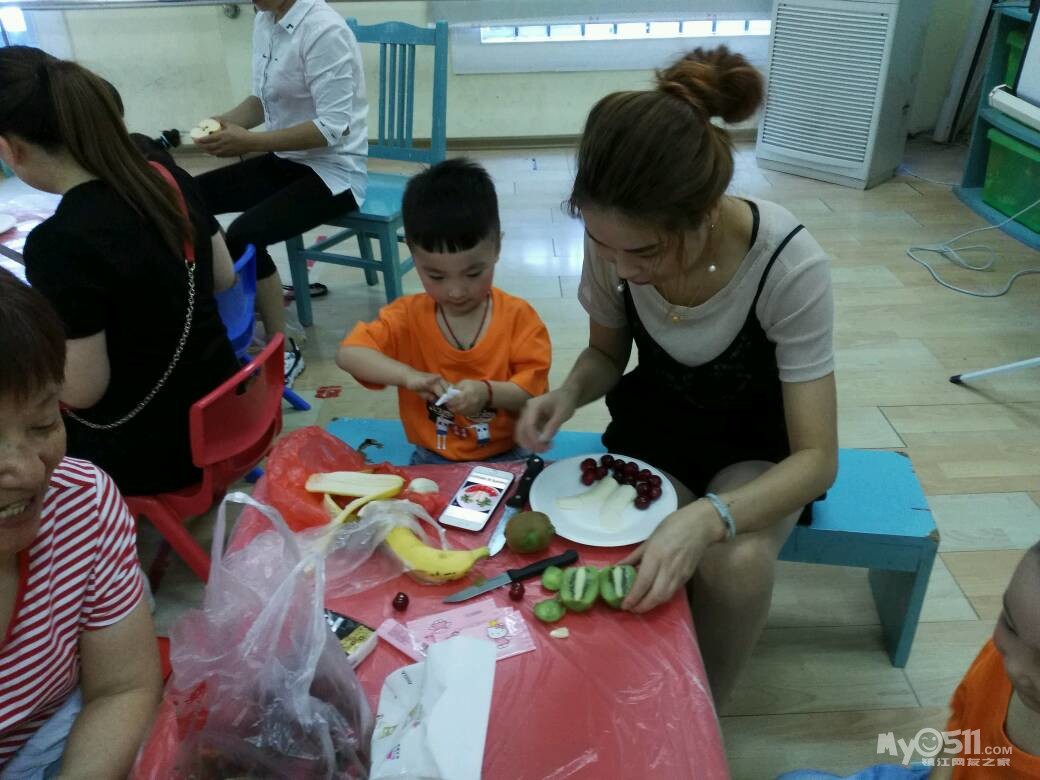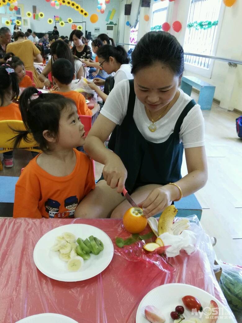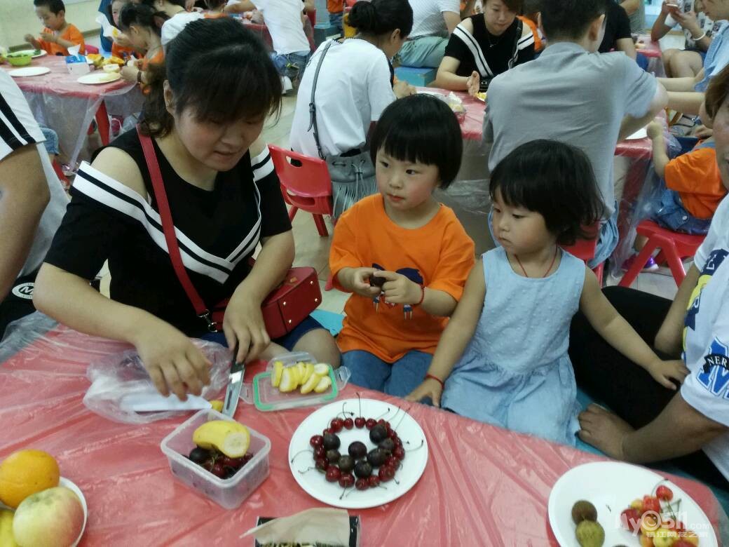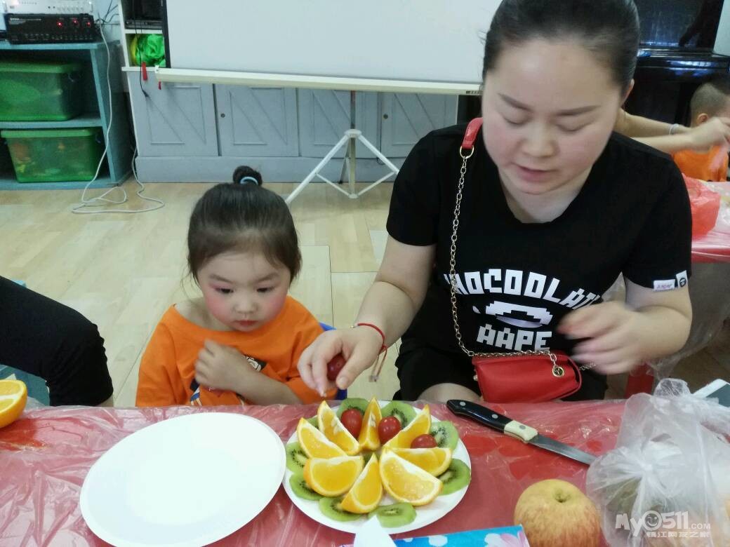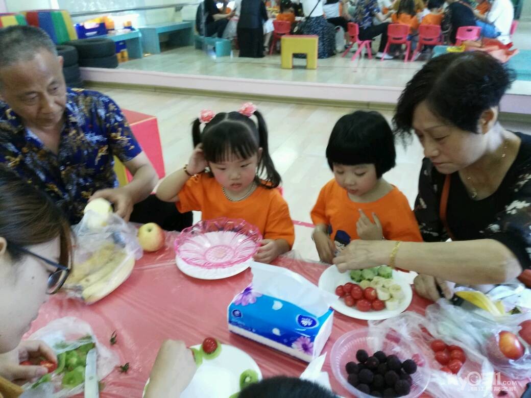 家长们和孩子共同制作水果拼盘