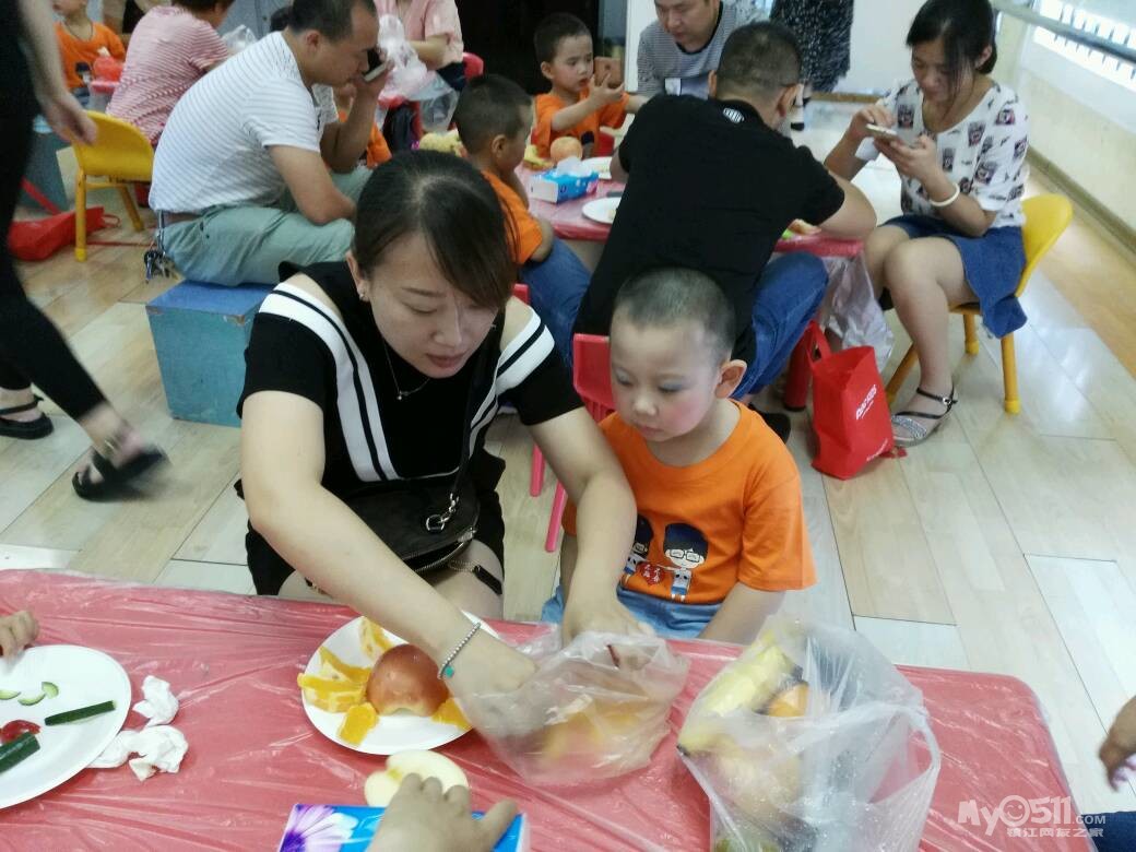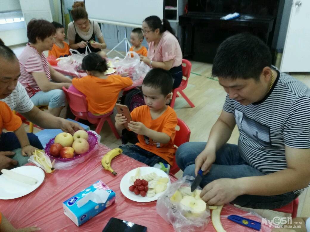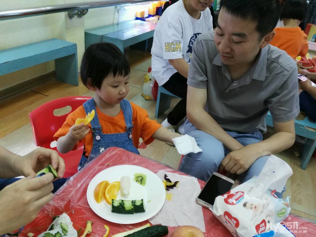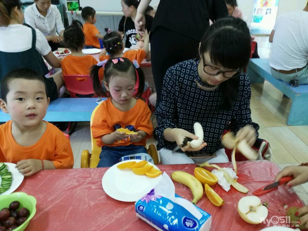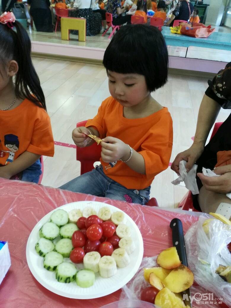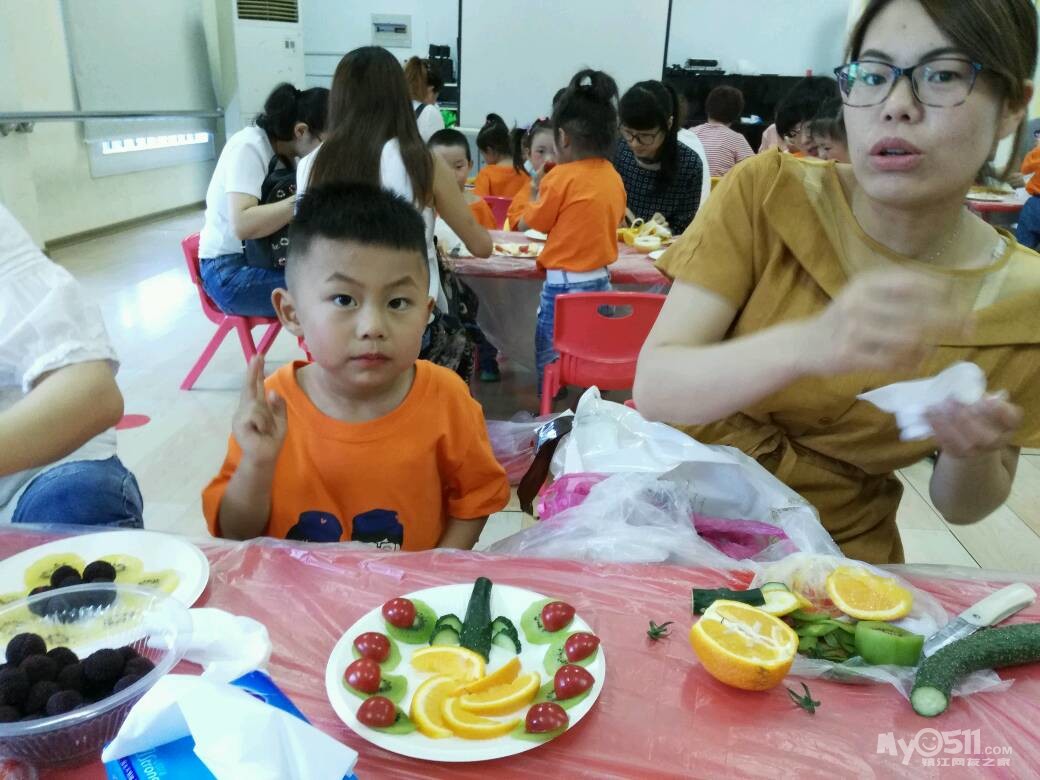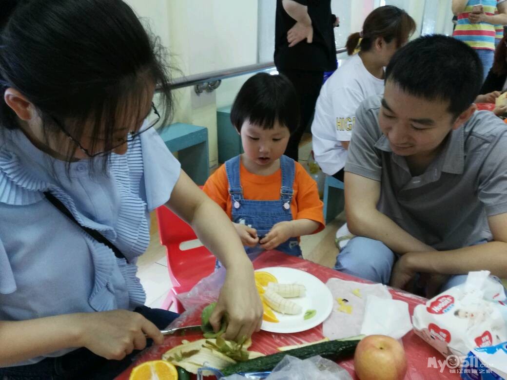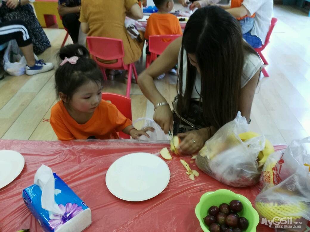 家长们和孩子共同制作水果拼盘