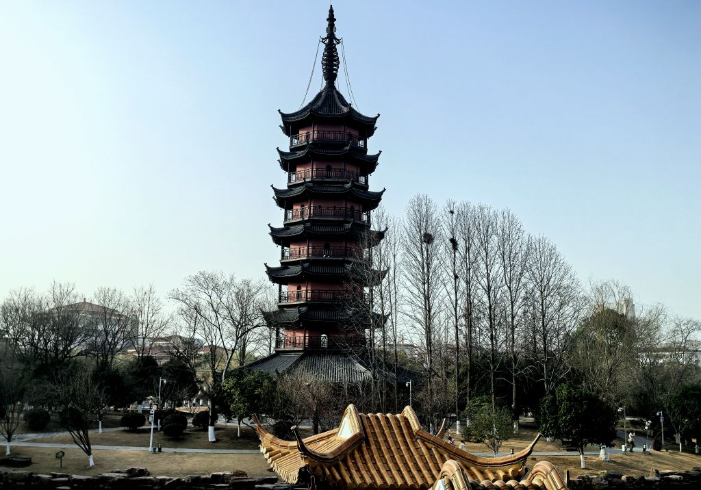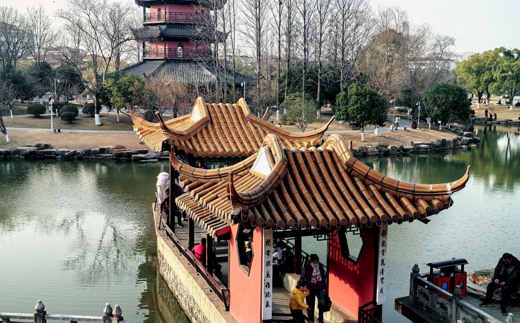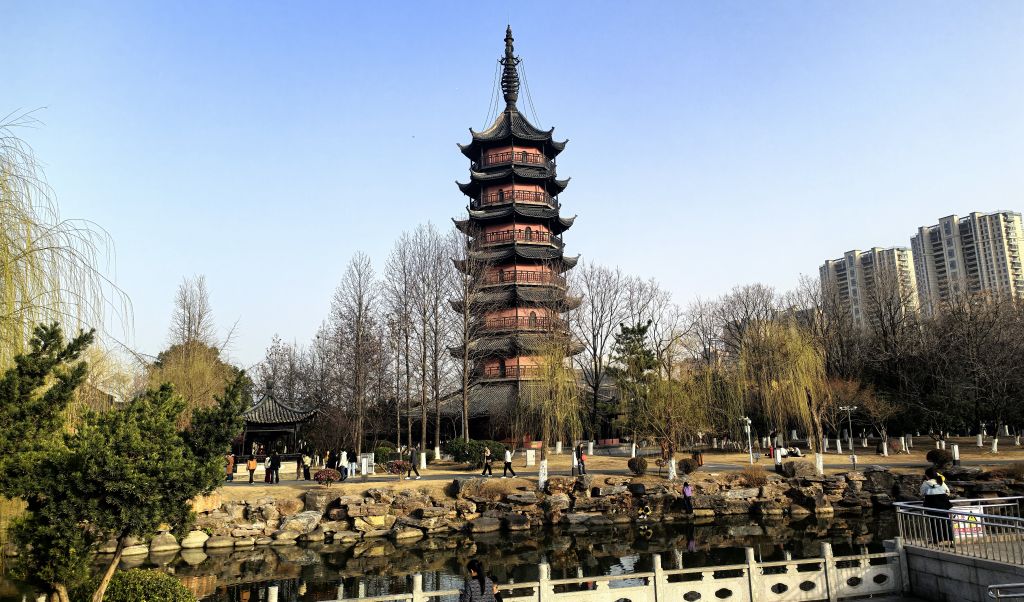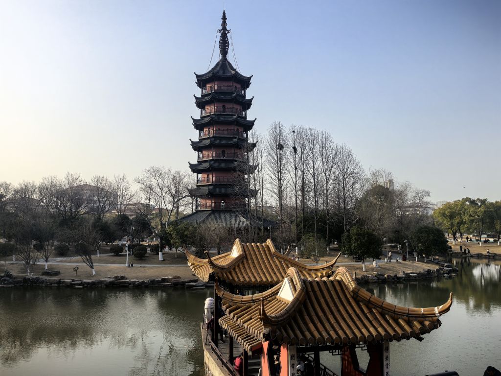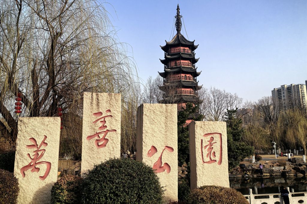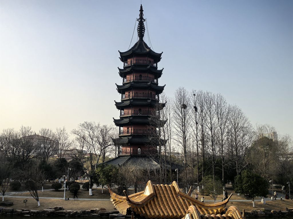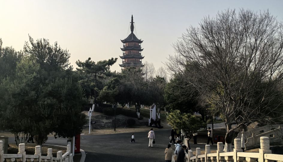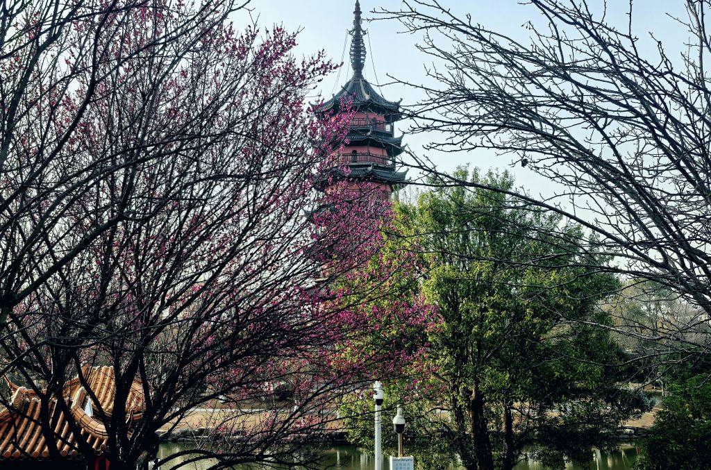 春光明媚,桃红柳绿。丹阳万善公园、海会寺。总前委遗址,红色印迹。春色宜人,游人如织,赏花踏春正当其时。崇祯年间古塔,八角方塔,古迹遗址,外观很像苏州瑞光塔。