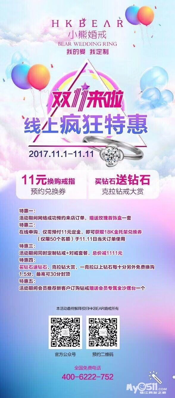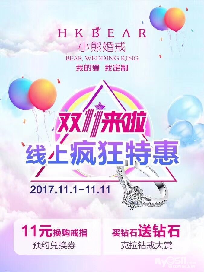 双11小熊不来福利怎么行?买戒指只需11元,裸钻+对戒订单再减1111元,买钻石再送钻石