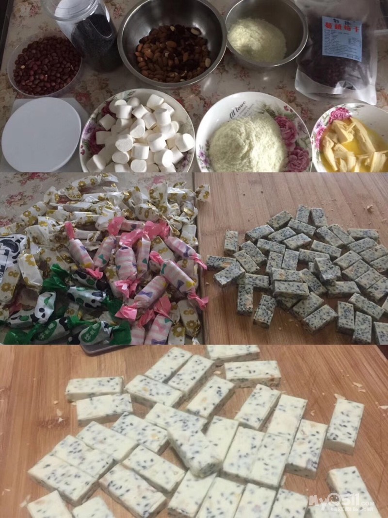 真材实料,花生芝麻的!奶粉进口脱脂的,黄油是新西兰滴!还有其它的核桃,夏威夷果,开心果等,这些价位要高哦!好吃极了!超市里的牛轧糖真的是各种添加剂哦!