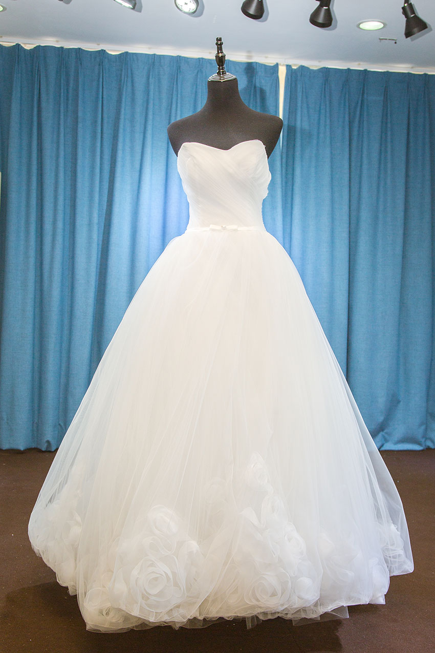 NO.5婚纱的经典抹胸,用独特的褶皱感打破传统的单调感,层层叠加穿着更性感个性!腰间丝带的设计起到收腰的效果,将腰线完美展现。裙摆层层叠叠的花瓣设计又透出一丝浪漫。