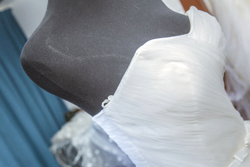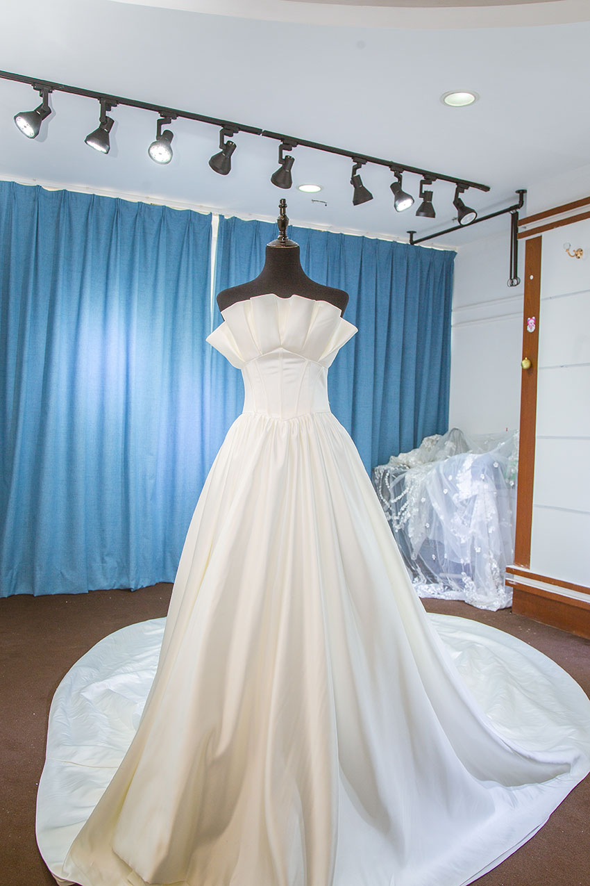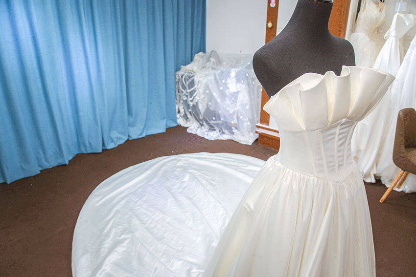 NO.3经典宫廷式的一字肩让性感尺度提升,展现出新娘美丽的锁骨和香肩,将甜美与性感瞬间释放。修身收腰剪裁,拉长身线,使得曼妙的身姿让人回味让人着迷。绑带设计,灵活调节松紧度隐藏的鱼骨支撑上身,塑造秀丽挺拔身姿。