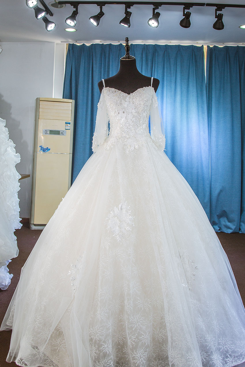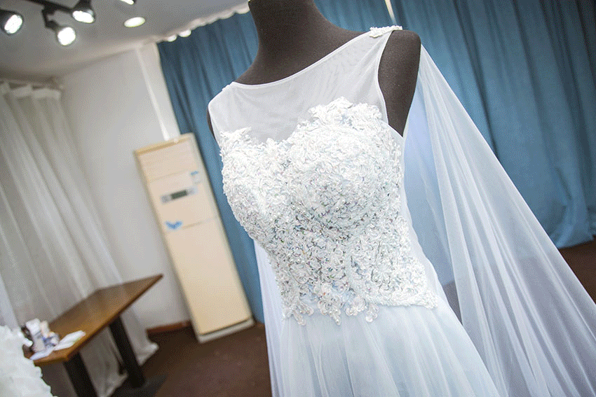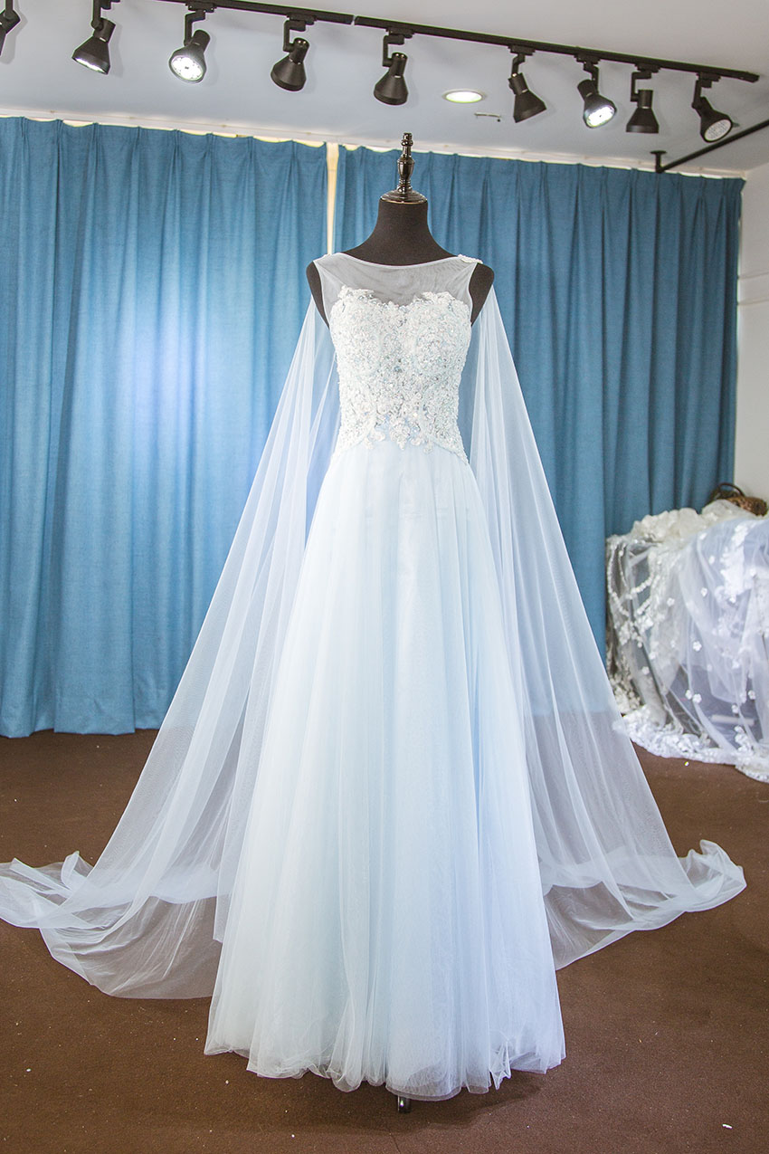 NO.8这款冰蓝色的礼服很受新人的喜爱,颜色淡雅,肩纱的设计显得很飘逸浪漫,半透的胸口设计有一丢丢的性感,上半身重手工蕾丝设计更显出仙气十足。