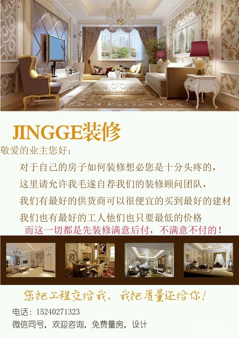 小弟在这里祝各位新郎新娘百年好合 幸福美满,姻缘有望那是天作之合,人潮人海中就那么惊鸿一瞥就能叨中真命天子或者真命天女 内个小弟是干装修的,业内最低价,质量好,先装修,满意后再付款,不满意一分不要,再送一年免费保养,话不多说 15240271323 v同号 再来俩图