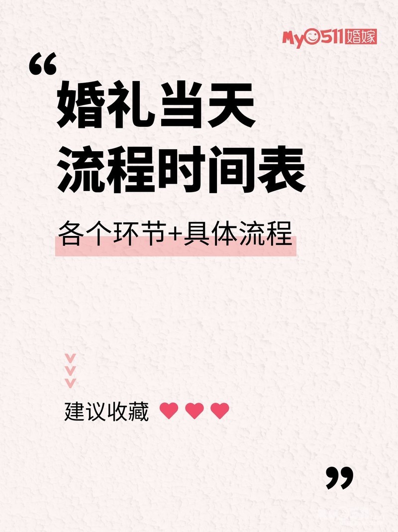 下面为大家整理出结婚当日流程安排,结婚当天每个时间要做什么都非常详细了,一起看看吧。