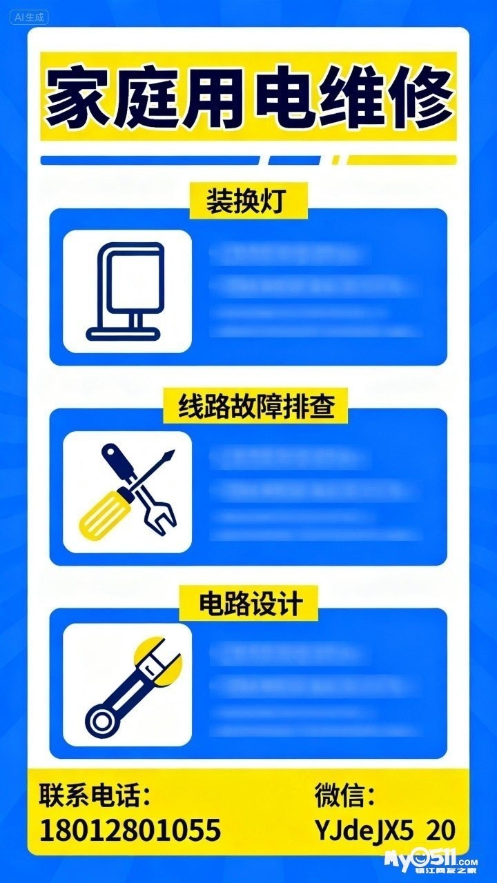 本人在国企做电工工作,从事电工专业15年,平时晚上或周末接一些家庭电路电器维修,比如装换灯,排查故障电路等,有需要的联系我。价格公道,号码18012801055,v信YJdeJX5_20