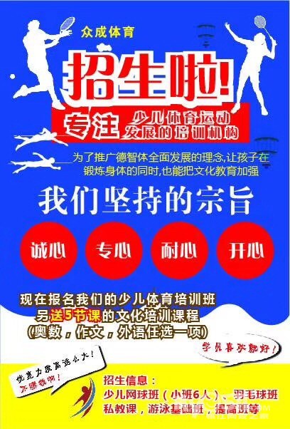 各位家长们您好,众成游泳俱乐部,暑期预售正式开始啦秉承着我们的精品小班化教学的理念,开设少儿6人班课,成人6人班课,私教课,亲子班课,另外转发此条消息连续转发朋友圈3天,凭截图报名即可减100元报名费,仅前50名享有这个优惠!另外还送专业儿童泳帽!!!上课地点 三茅宫吉华碧波游泳池,学府路沸力仕游泳池♀心动不如行动,我们拥有专业的教练员,优质的服务态度,舒适的教学环境,欢迎各位前来享受我们众成体育的优质服务[愉快][愉快]。拨打热线电话 18252581707微信同号