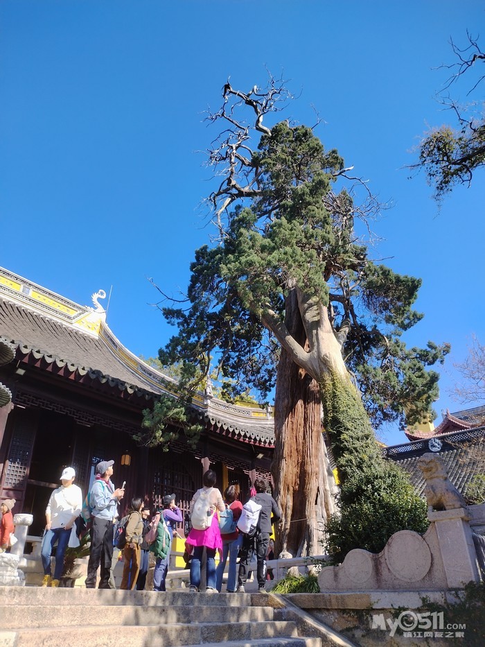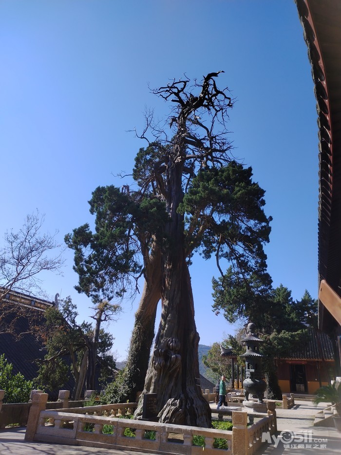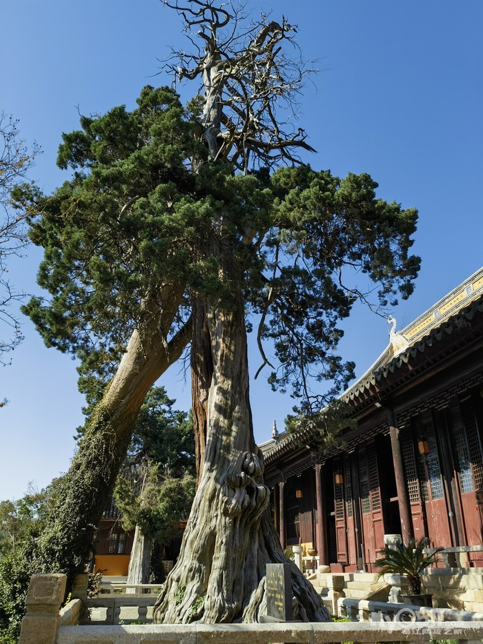 大雄宝殿前有巨柏三棵,树龄一千八百余年,最粗一棵腰围5.2米,挺拔劲秀 活化石。康熙帝所题《松风水月》碑,乾隆赋并书写的一块诗碑《再邓尉香雪海歌旧韵》