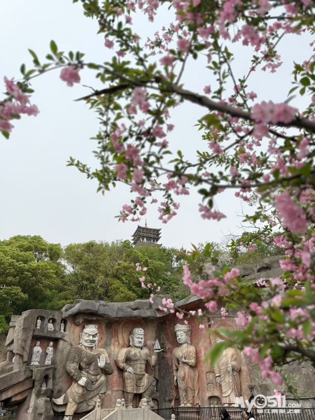石窟静立山间,樱花如雪轻轻落,历史与自然的诗篇在春风中低语