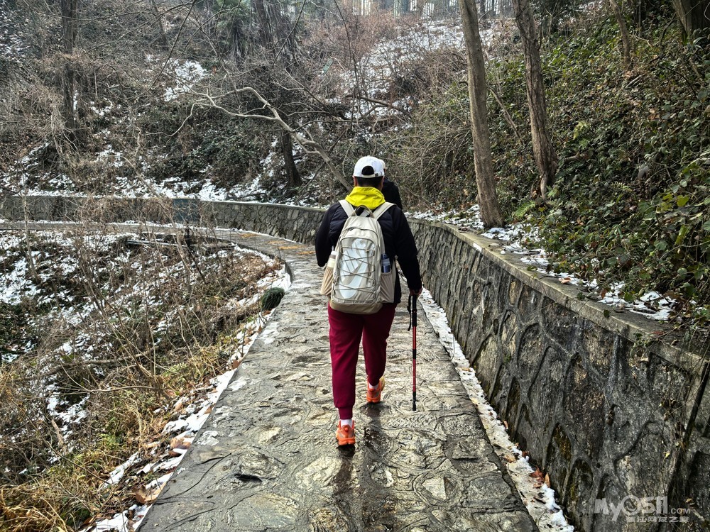 从西马腰继续沿着华泰登山道攀登,正常步行约三十分钟左右终于抵达头陀岭,这里是紫金山主峰,海拔448.9米。因当天气能见度差,遗憾没能望见南京城全景,稍作休整后继续出发,借道进入明孝陵,紫霞湖进入眼帘,正是腊梅花开美不性收的季节,雪后腊梅进入最佳观赏期!