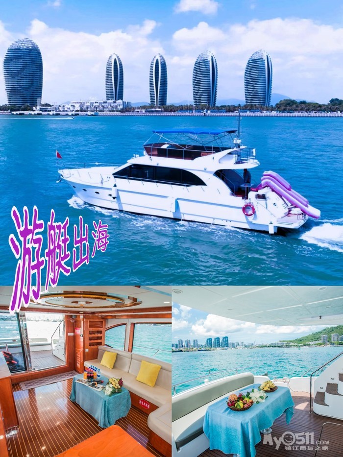 游艇码头出发→远眺鹿头情人山→小青州→凤凰岛→情人湾→远眺第一大道椰梦长廊→三亚角→帆船港附近海域抛锚娱乐→返回码头