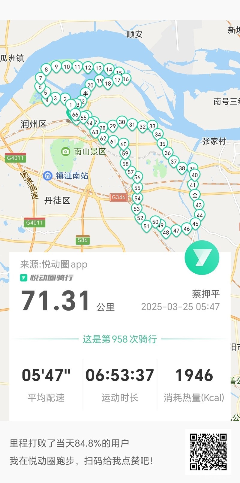 今5点45分出发晨骑,经健康络、正东路路、学府路、左湖路、金港大道、谏辛路、辛丰镇、大圣寺、丹徒站、智慧大道、春晖路、又拾了一方便袋牛粪、晋元大道、丁卯桥路、梦溪路、运河路、南门大街、观音桥巷、市政路、将军巷于9点52分平安到家。