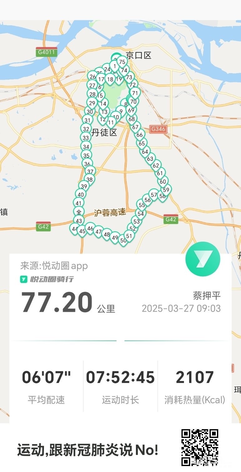 姊舅相约9点在栗子山公墓二道门前集中,给岳父岳母扫墓祭祀,我仍骑自行车前往,上坟结束,就沿环山路、G346、九华山路、南徐大道、黄鹤山路、北府路、健康路。