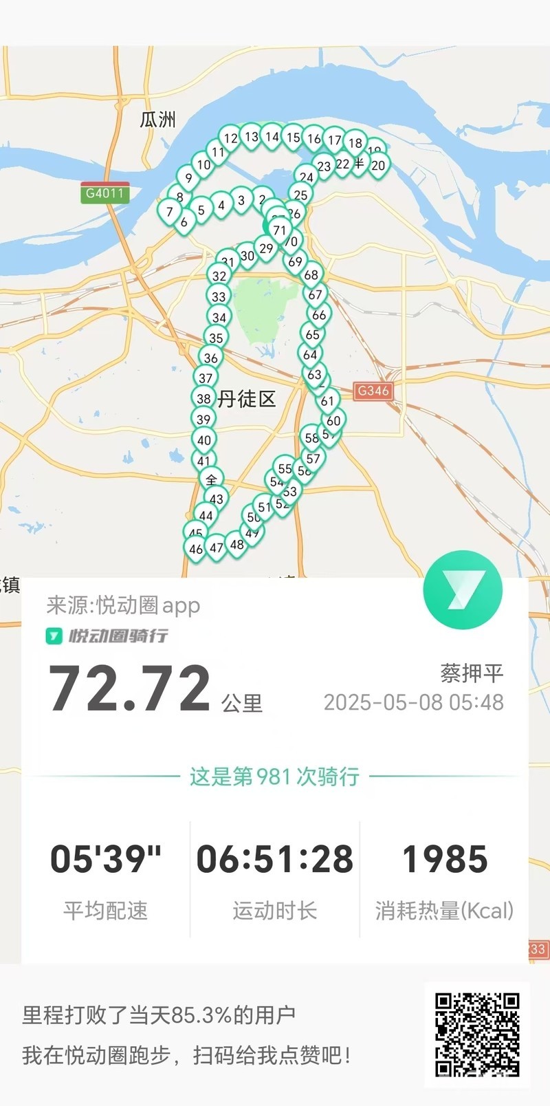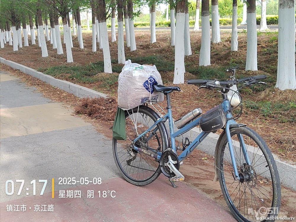 2025年5月8日早5点48分出发晨骑,沿中山路、双井路、长江路、润州路、京江路、滨江路、东吴路、五条街、万古一人路、大西路、缷桥街、山门口街、腰刀巷于8点42分平安到家。