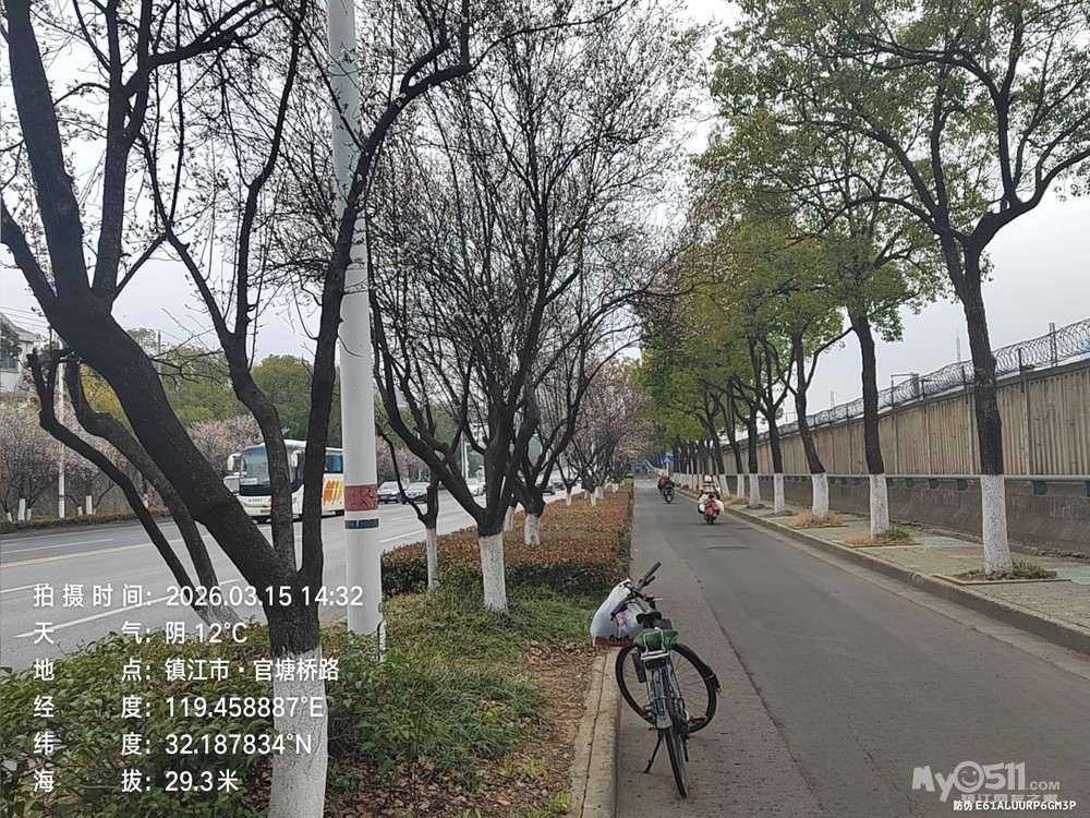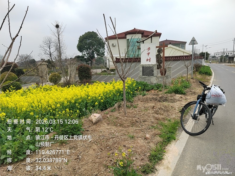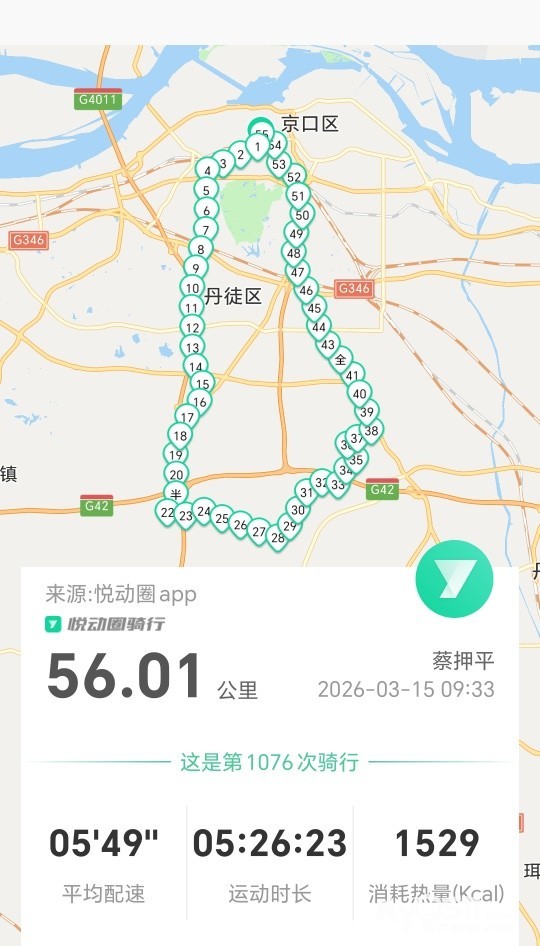 2026年3月15日上午9时许出发骑行。沿仁章路、北府路、檀山路、茅以升路、自槐荫村骑村村通,由香海琴枫上G312、经官圹桥路、解放路、健康路、经折巷、白莲巷、山门口街、将军巷于下市2点22分平安到家。