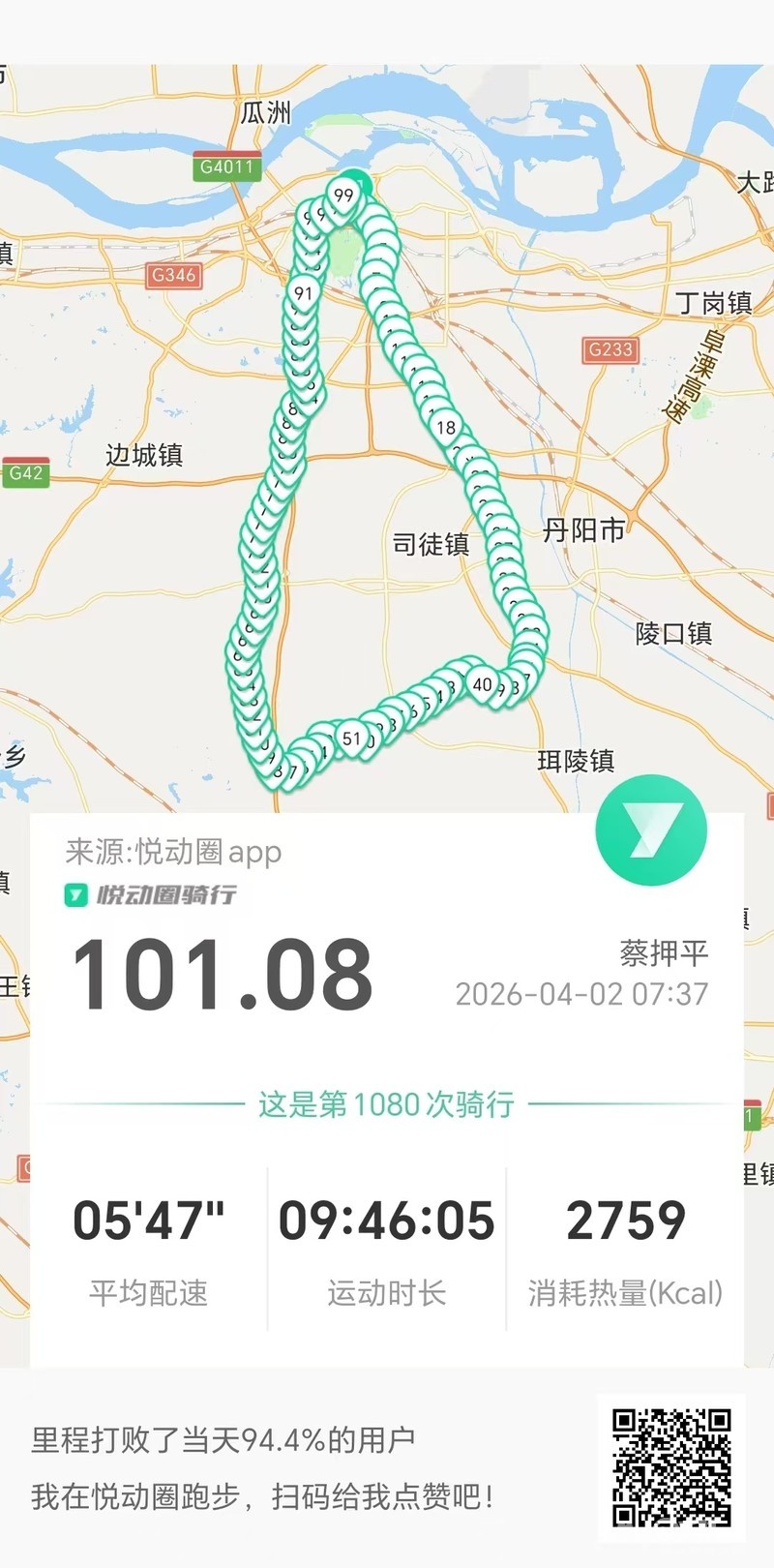 2026年4月2日完成百公里骑行,一路奔赴丹阳大圣村,只为邂逅春日油菜花海,沿途的微风与绿意,早已让人心生欢喜,抵达目的地时,眼前的盛景更让人觉得一路奔波皆是值得。