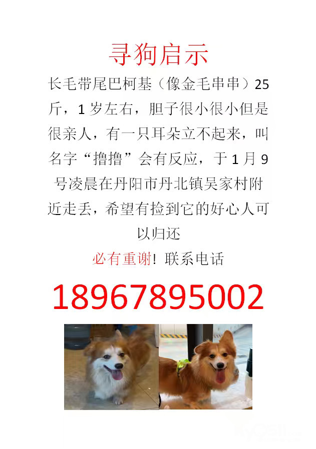 寻狗启示:长毛柯基,一岁左右,公狗,1月9号镇江丹阳市丹北镇埤城镇尧巷吴家村 走丢,一只耳朵立不起来,如果有看到的好心人麻烦联系一下18967895002,必有重谢